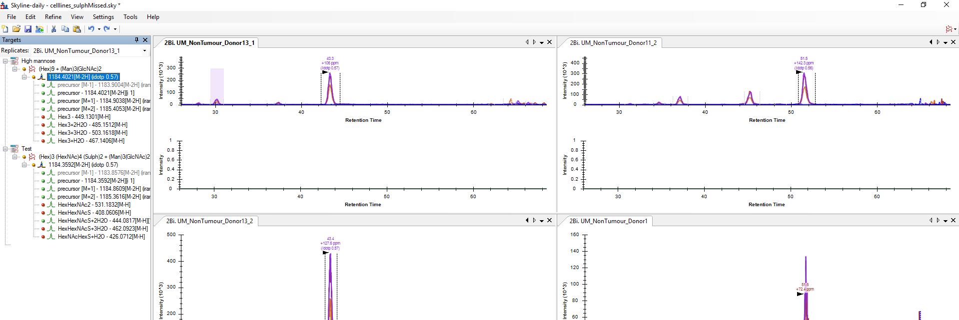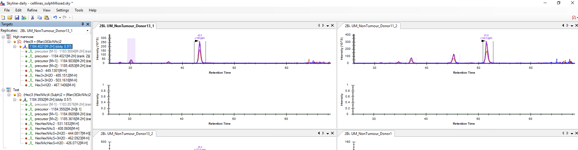 Can you send us your Skyline document again? The one you sent us the first time does not have the same molecules in it as the ones in your screenshot.