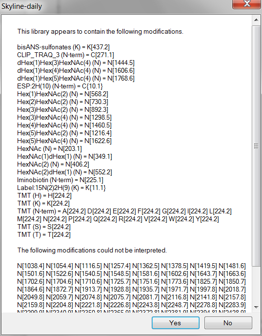 In building a library (Settings menu, select Peptide Settings, go to Library tab, click on Build button), it appears that Skyline does not like "unknown" modifications (modifications not mappable to Unimod(?) based on delta mass). See attached screen capture. I am using Skyline-daily (64-bit) 2.6.1.6899.