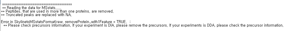 I have received the following error in the immediate result window running the external tool from Skyline. it is a DIA experiment and have been curated. The targets were corrected for the right peaks. When the data were run in Data Processing and Group Comparison (Healthy vs Disease), setup as outlined in the pdf. Precursors have been removed. ** Reading the data for MSstats..... Can't finish analysis. |