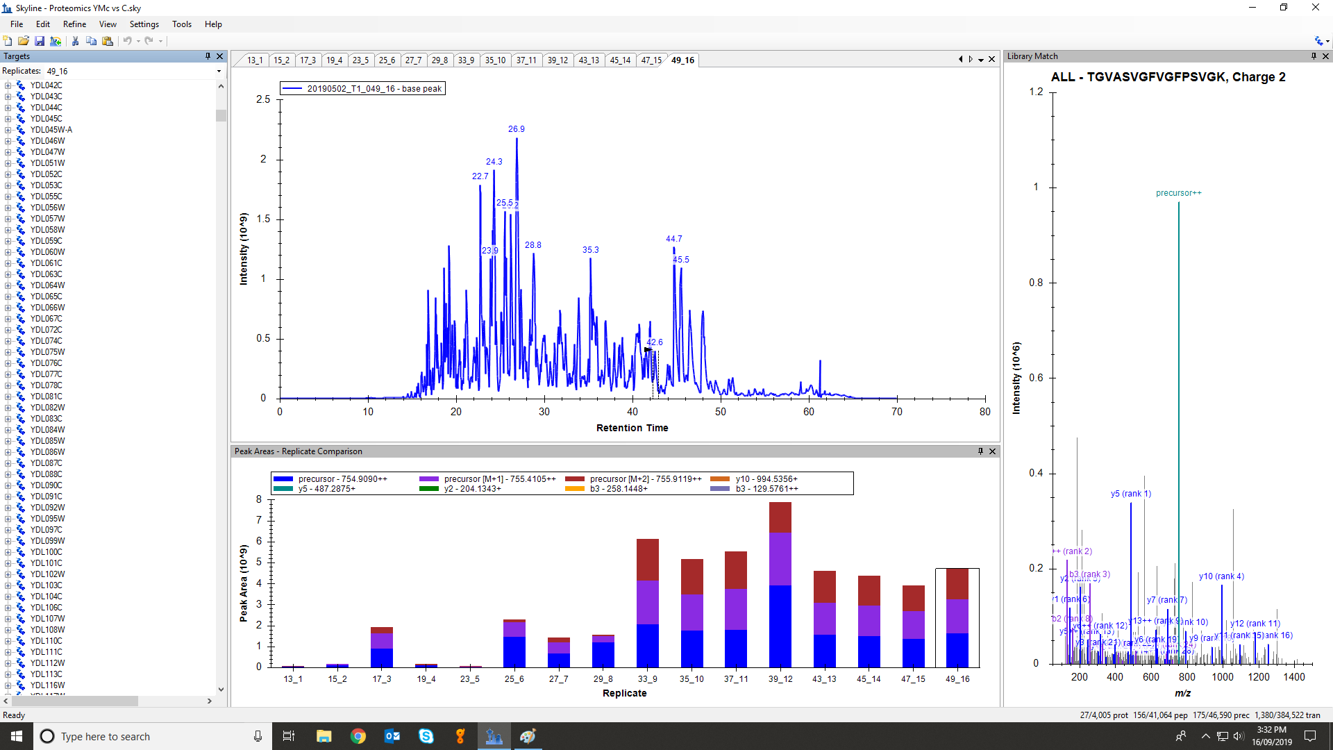 This appears to be quite old. Sorry that it went unanswered. From your screenshot, it looks like your Peak Areas - Replicate Comparison plot is only showing precursors. You can fix that by using right-click > Transitions > Products, or you could choose All and then use "Split Graph" to split the chromatograms into two panes showing both Precursors and Products separately.