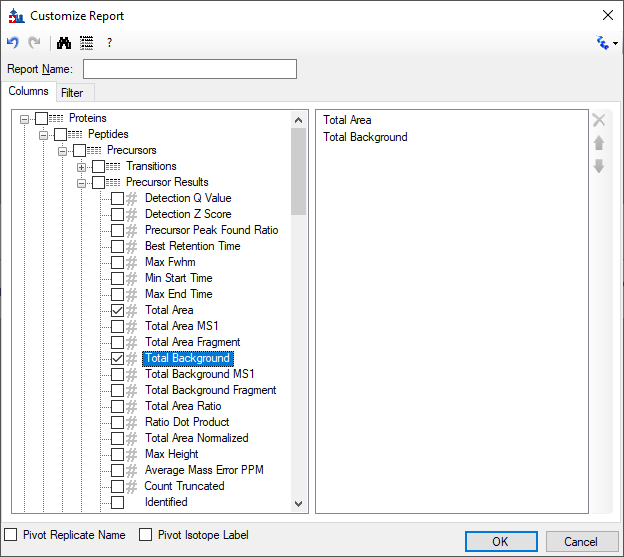 You can find the Total Area and Total Background columns under in the Customize Report dialog under: