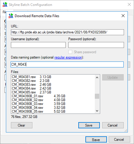 I was wondering if there is a way to import a sample list (e.g. csv file) to Skyline Batch with the exact files I would like to download? Sometimes a general expression won't solve everything (?) or perhaps I just don't know how to use it fully.