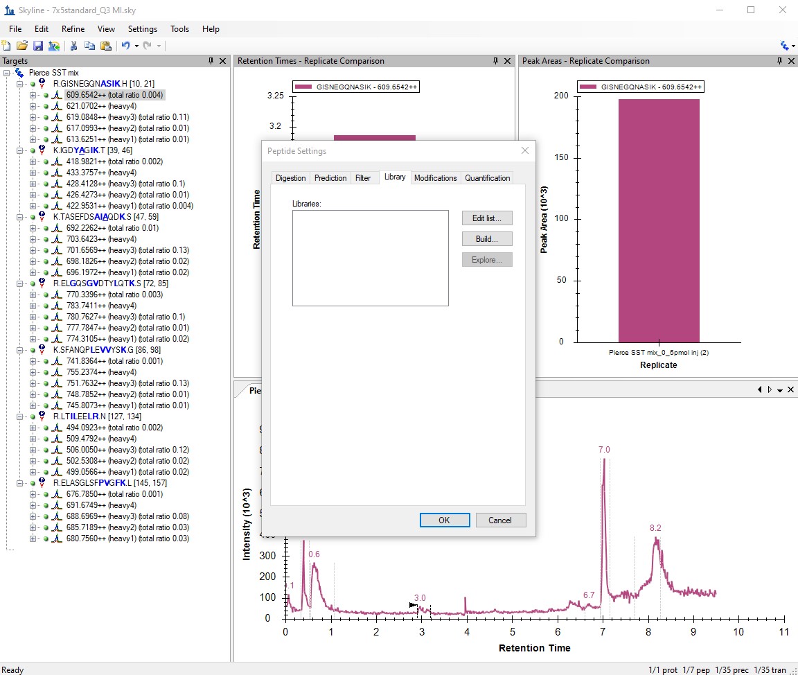 I received a Skyline document from Pierce along with their 7x5 synthetic peptide mix for evaluating system suitability data from those peptides. I would like everyone in our group to be putting data into this document, so it should be as uncomplicated as possible to use. However, the document automatically expects a spectral library that isn't provided, and Pierce's instructions tell you to just ignore the pop-up message about the missing library. The problem is that in the absence of the library Skyline does not import the data completely, resulting in the message "chromatographic information unavailable". Deselecting, removing, or resetting the library in Peptide Settings resolves the issue temporarily, but upon importing more data or making a copy of the document, the library shows up again! How do I permanently remove this "missing library" from the document? Problematic document is attached. Thanks for your help!