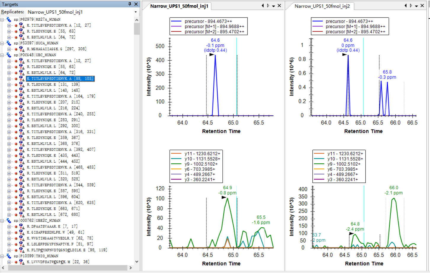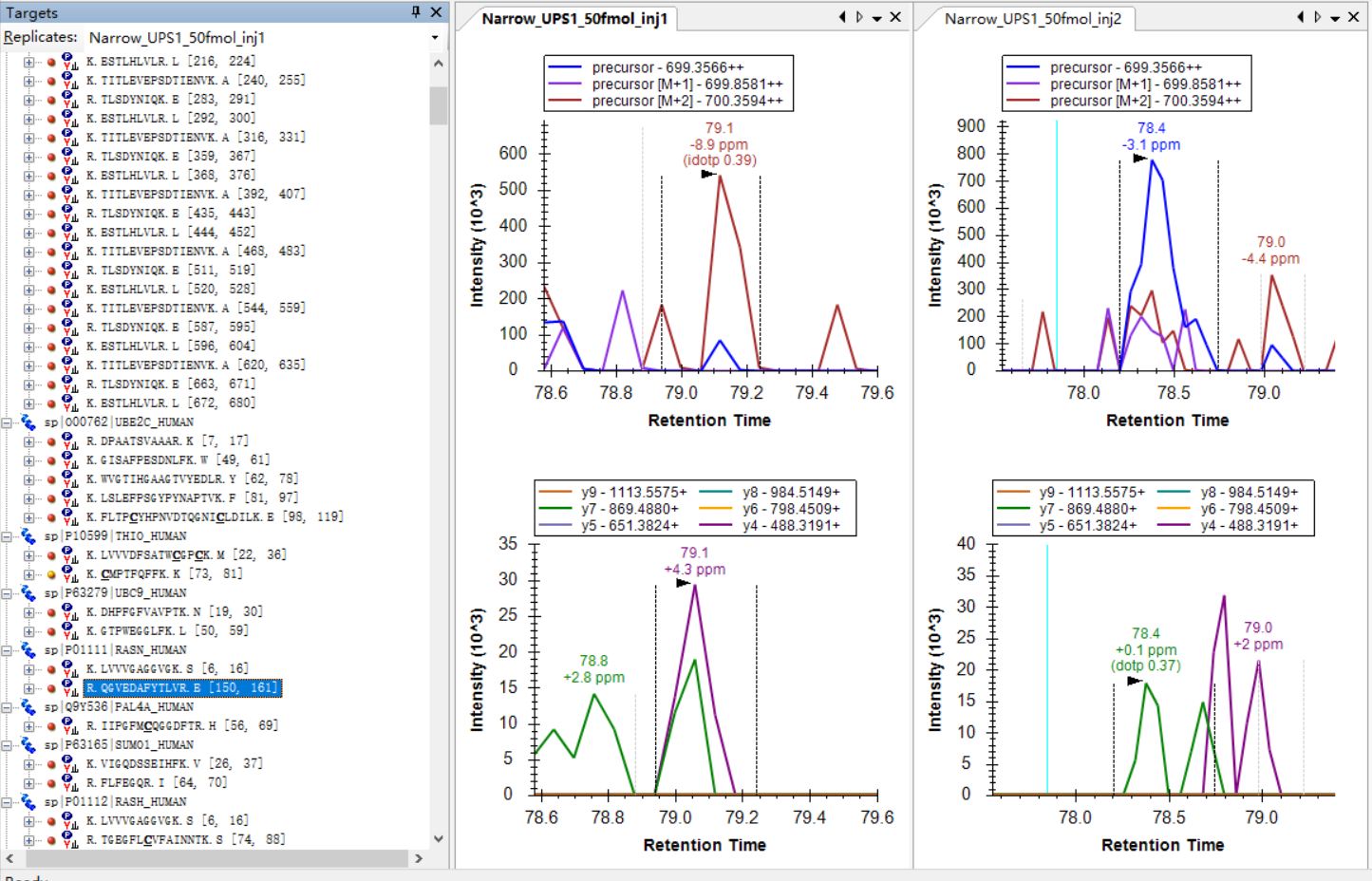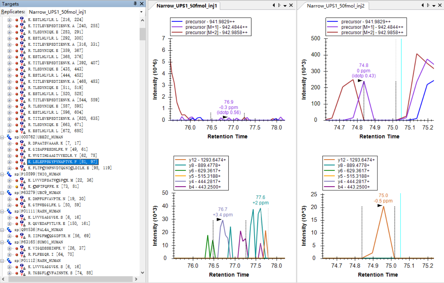 I would have thought that it would be straightforward for me to look at "RD139_Skyline_Narray.sky.zip" and compare it to your Skyline document and see why your chromatograms do not look good. Unfortunately, for some reason, the .sky.zip on the MassIVE server only contains the Biognosys iRT peptides and decoy peptides. I have no idea why a document like this would exist which was missing all of the target peptides.