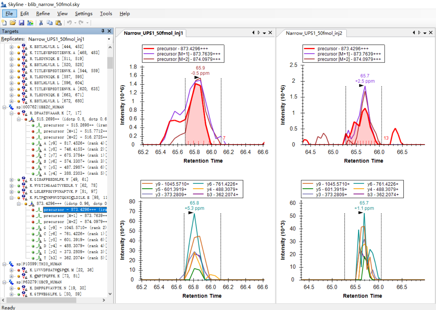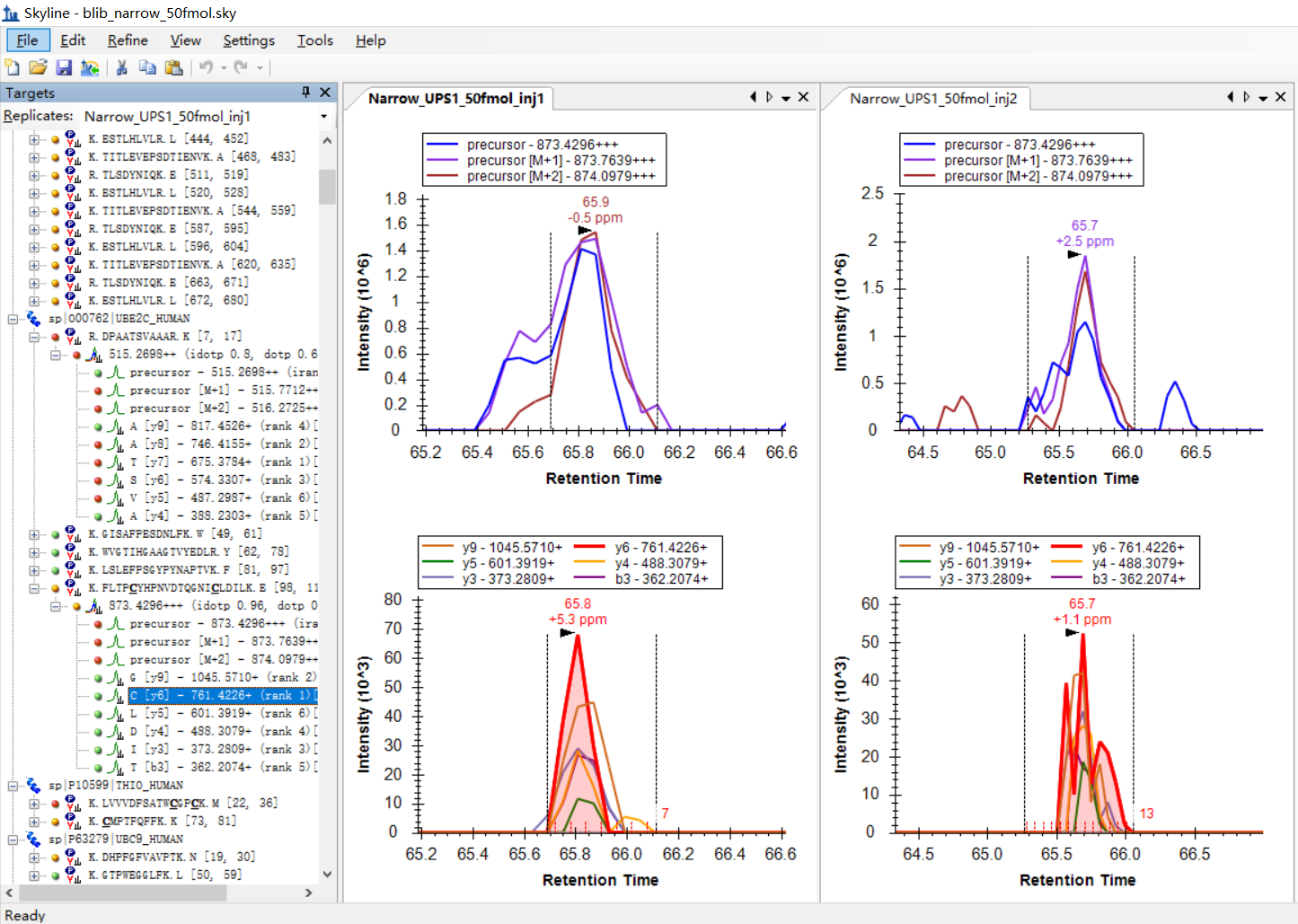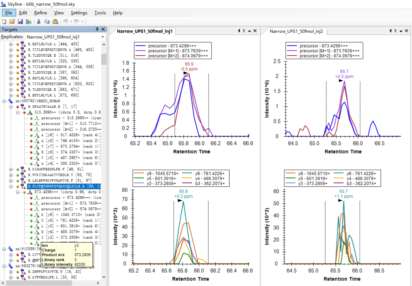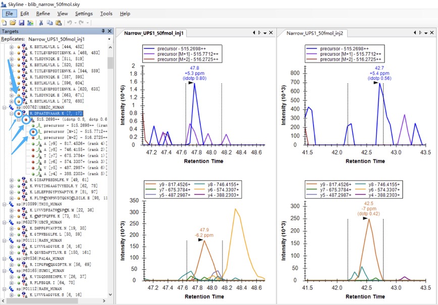 I took one of the Skyline documents from the paper, and then I went to "View > Spectral Library" and did "Add All" and then extracted chromatograms from "RD139_Narrow_UPS1_50fmol_inj1.raw" and I have put the document here: