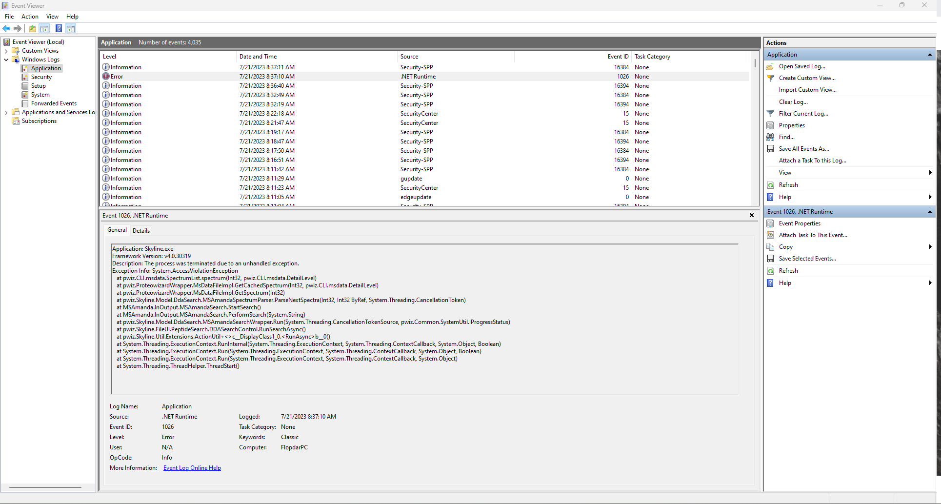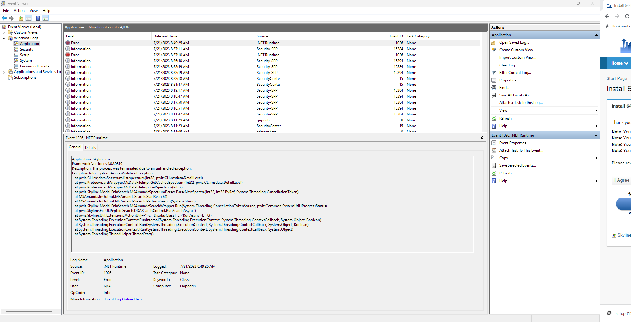 Ok, I had visual studio 2017 Pro installed. I installed visual studio 2022 community and reran the skyline search. The application event errors from event viewer are attached |
