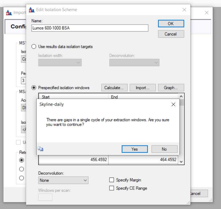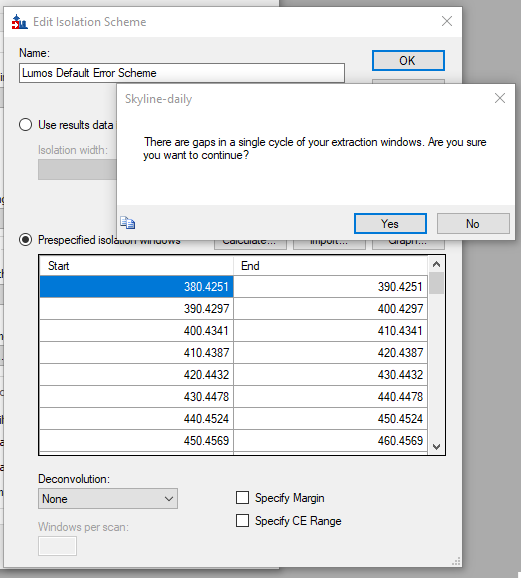 The isolation scheme "Lumos 600-1000" was made by Importing the isolation windows from the .raw file itself and saving it as a new scheme. I got a warning about a gap in a single cycle of my windows the when I did this, which I've attached in case it's relevant. |