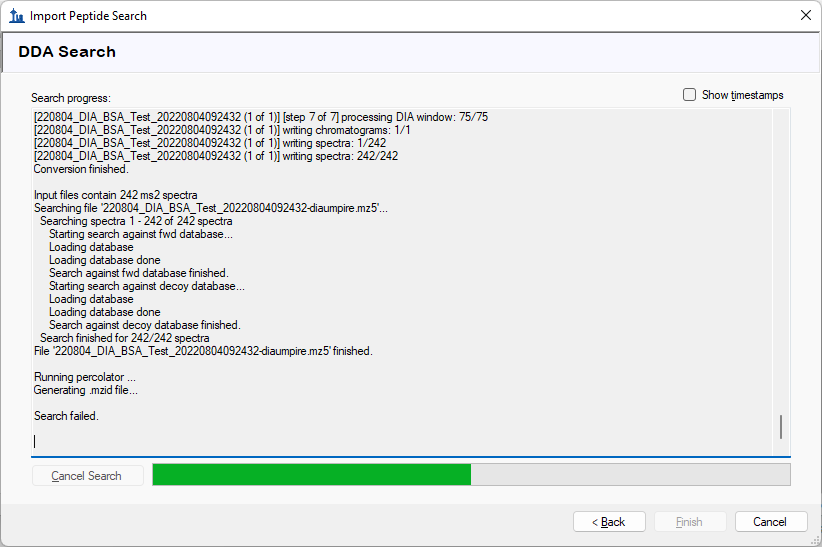 When I tried doing a DIA search of this file on my computer, all I get is a "Search Failed" when it gets to the part where MSAmanda is supposed to search the .mz5 file with the DIA Umpire pseudo spectra in it.