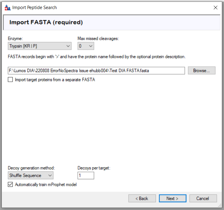 I think we've narrowed down the issue to the .raw files themselves from our Fusion Lumos. When we use the .raw to make an isolation scheme the imported scheme does not reflect the settings assigned in Xcalibur. It has gaps and lacks the specified margin it was meant to have. This is with Thermo Xcalibur DIA preset settings. We have a .raw file made using default DIA settings by another thermo instrument from another lab and none of these issues occur despite identical settings. It seems like Skyline isn't understanding the data and giving either a "percolator failed" error or the "ERROR: no spectra were found" error because it can't read the file (I have seen both several times each as I've tried to troubleshoot the problem). Is this an issue you've seen before? |