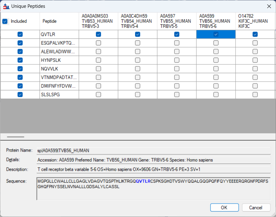 I want to check uniqueness created due to tryptic digest. When I check Edit > Unique Peptides, QVTLR is blue checked under multiple proteins. I just want to make sure I understand the purpose of blue check?