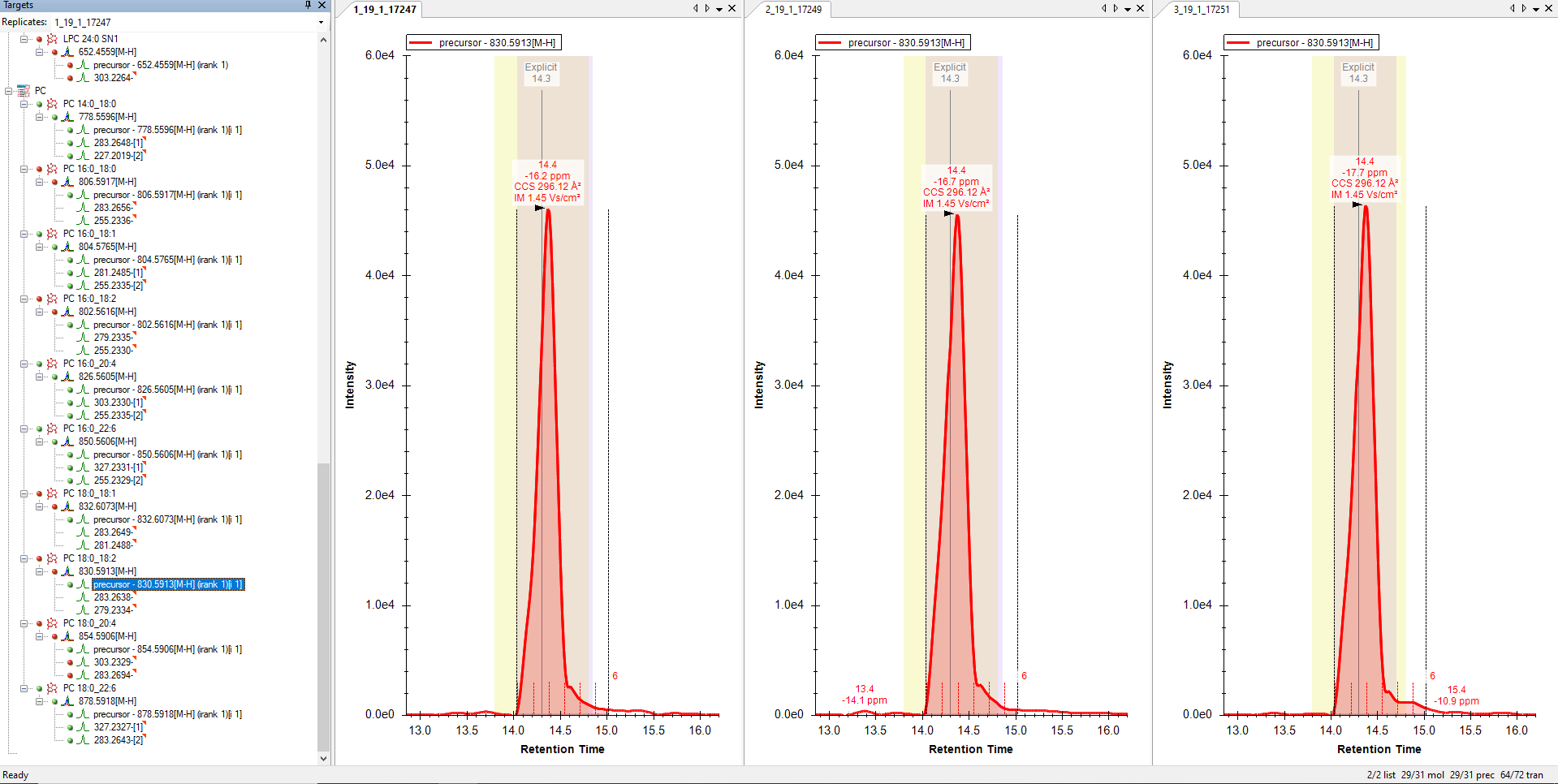 As indicated in the screenshots, the precursor peak area is clearly visible but when trying moved to individual transitions of the same precursor, nothing can be visualised (not even the yellow zone of the explicit retention time window).