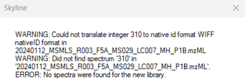 In a similar approach based on Orbitrap instruments we previously successfully used the .ssl format and a conversion of the .raw file to .mzML in order to build spectral libraries in Skyline (shown in screenshot "raw ssl.png"). A similar approach using a .ssl file with ZenoTOF .wiff2 files converted to .mzML files (shown in screenshot "wiff ssl.png") resulted in an error message regarding the scan number ("Error sciex.png"). There seems to be an issue with the "native id format" used in .wiff/.wiff2 - however, the use of .ssl files seems to completely rely on the scan column being present and populated. Is there any advice known, on how to successfully link specific ZenoTOF MS/MS spectra within a run to particular compounds when builing spectral libraries in Skyline?