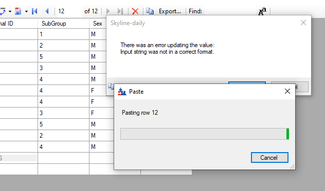 I've successfully implemented using the lists/live reports feature in Skyline Daily - with an exception that I think could be an easy fix (maybe a way around it now as well). My collaborators had some duplicate Animal ID numbers (think 2 different cohorts of animals #104). They had different chip numbers which were unique 9 digit codes, and then I'm also adding in 'subgroup' and 'sex' into my list. In my runs/raw files, when I had duplicate animal IDs, I used a shortcut of animalID_last 2 digits of the chip (so 104_01 and 104_38 to differentiate two animals without having to include the 9 digit numbers). The lists feature currently does not currently support that format - it didn't like either '_' or '-' and so I'm currently only getting successful imports for the unique animals. I was thinking one way around would be to replace the dash with 0 - an easy find/replace on my list and update to my runs. But I feel like this might be something that happens to more than one person and if we could incorporate a character into the unique ID line on the lists that would be great. Please let me know if you think I've missed something or another easy work around already exits. Thanks as always! |