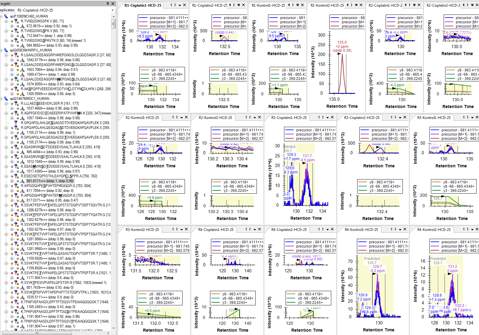 I had a course in targeted proteomics in Zurich last jun. Now I am trying to apply it to my experiment. I am working with phosphorylated proteomics. I have 4 biological replicates (each replicate with 2 fractions) comparing Jurkat T-cells conntrol vs cisplatin treated. After LC-MS/MS run, I performed search on Mascot using the default (0.05 Da and 10 ppm) against human database. After that I loaded the searched files on Skyline (DIA data with DDA spectral library) with the raw files to extract chromatogram.