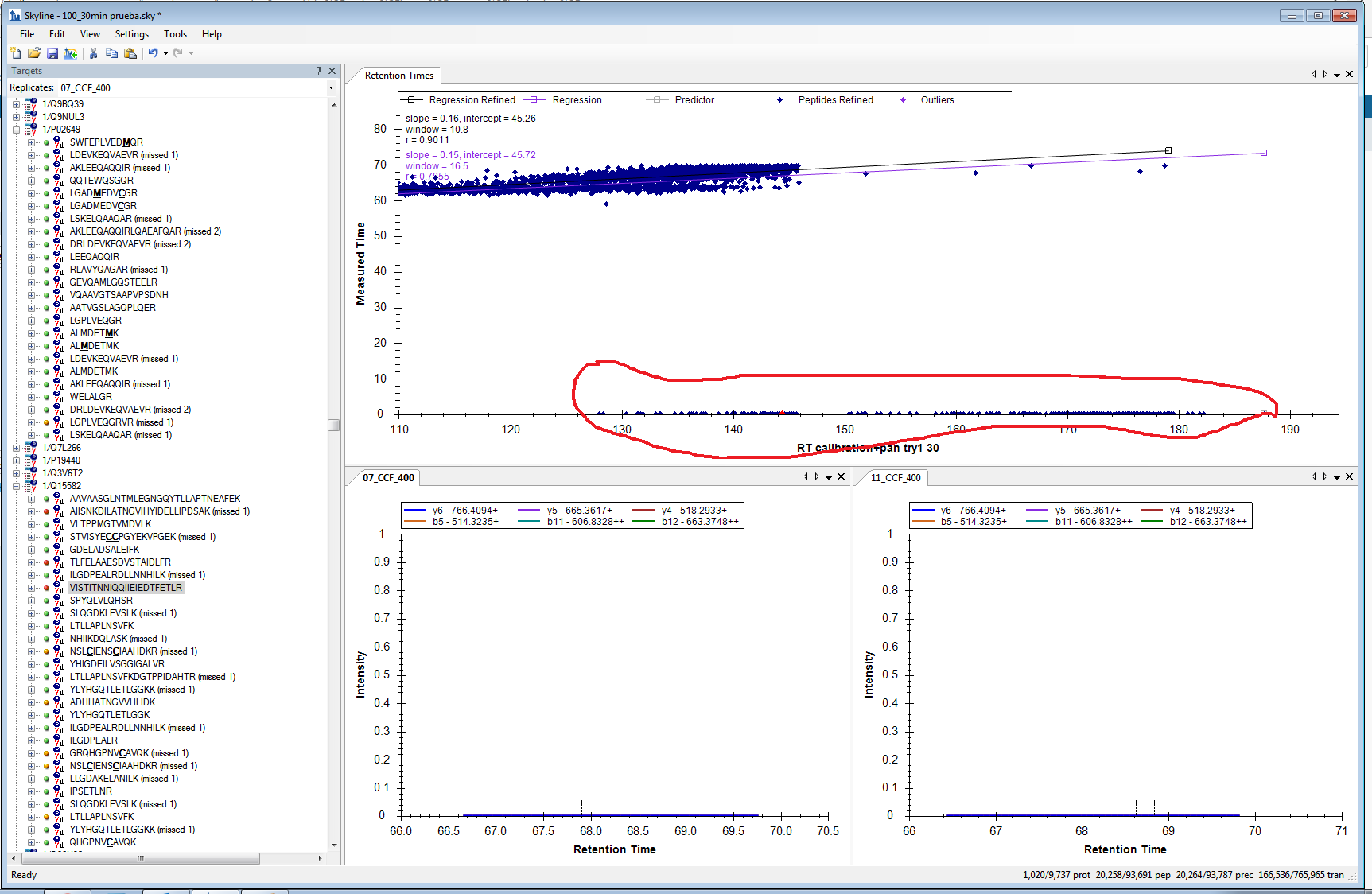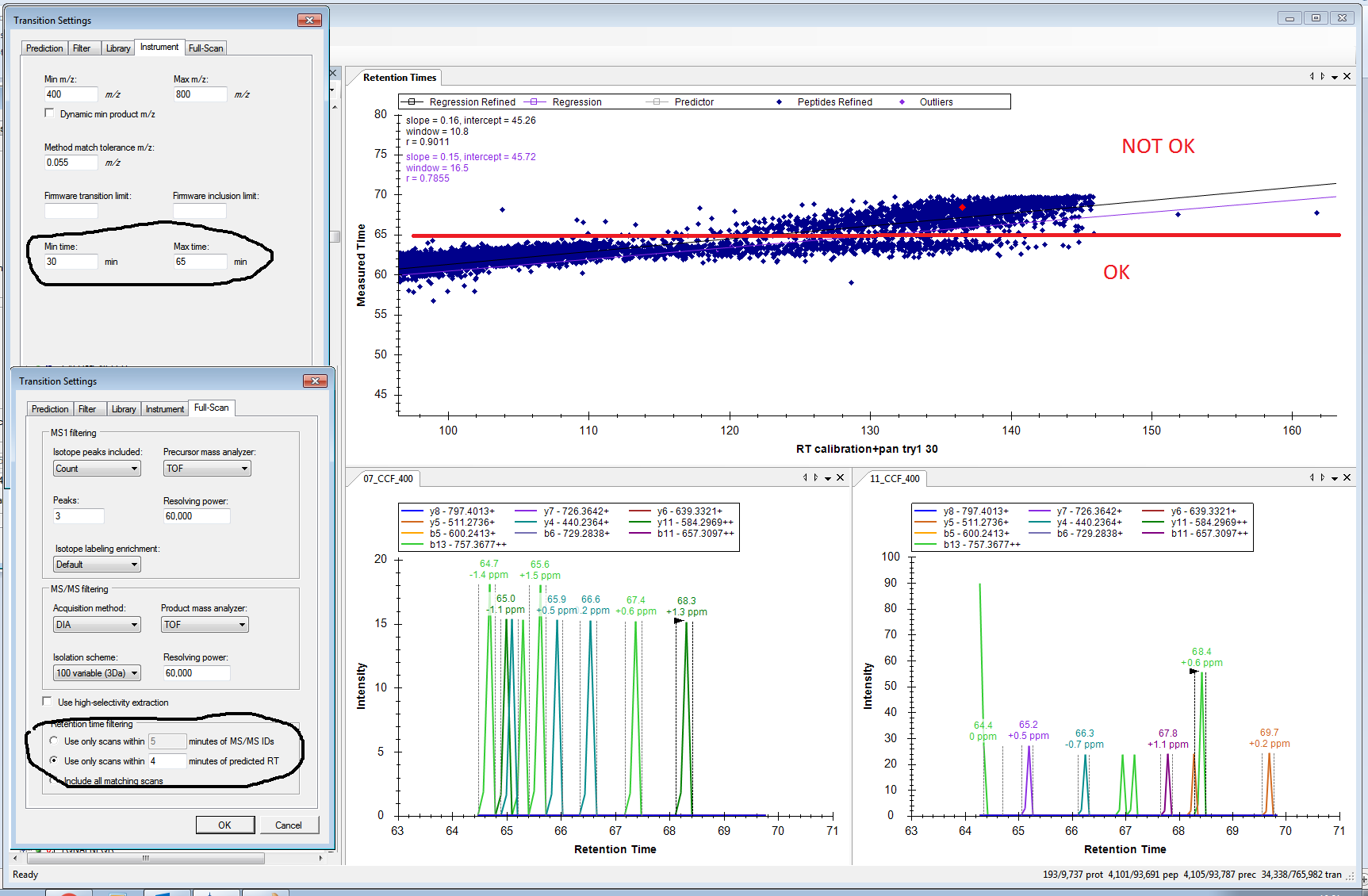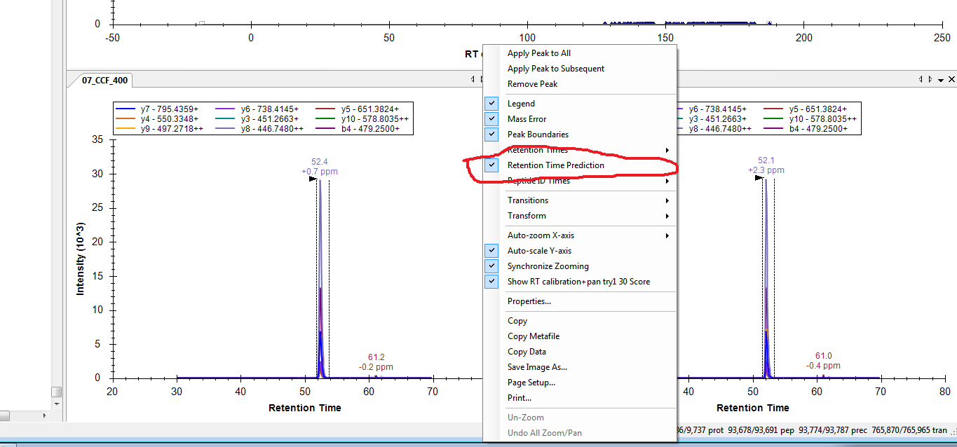 When I have problems like this seeing the prediction line and window when I feel it should be there, I usually start with View > Auto-Zoom > Both. Sometimes it shows that the prediction is just very far from the chosen peak or even the extracted time range, if chromatogram extraction was based on something other than the prediction.