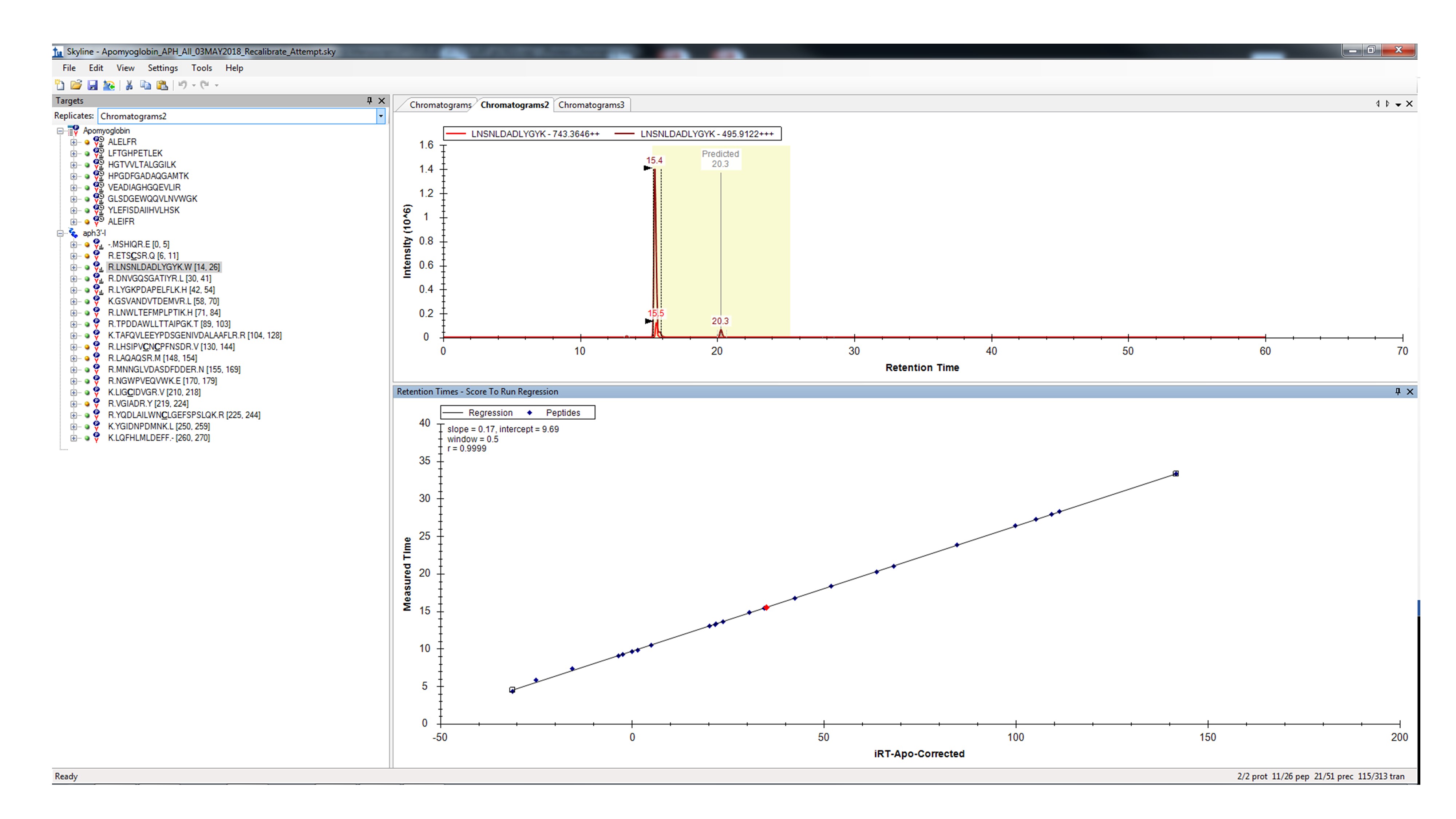 One more question about how skyline predicts peptide retention times. I've attached a chart to highlight my question. In this scenario, the same peptide elutes at different times with considerably varying ion intensities. The user selecting the correct peaks and recalibrated the iRT database shows near perfect linear regression, however, my question pertains to the yellow prediction box. How is this time predicted? It does not appear to correlate with the SSRCalc times.