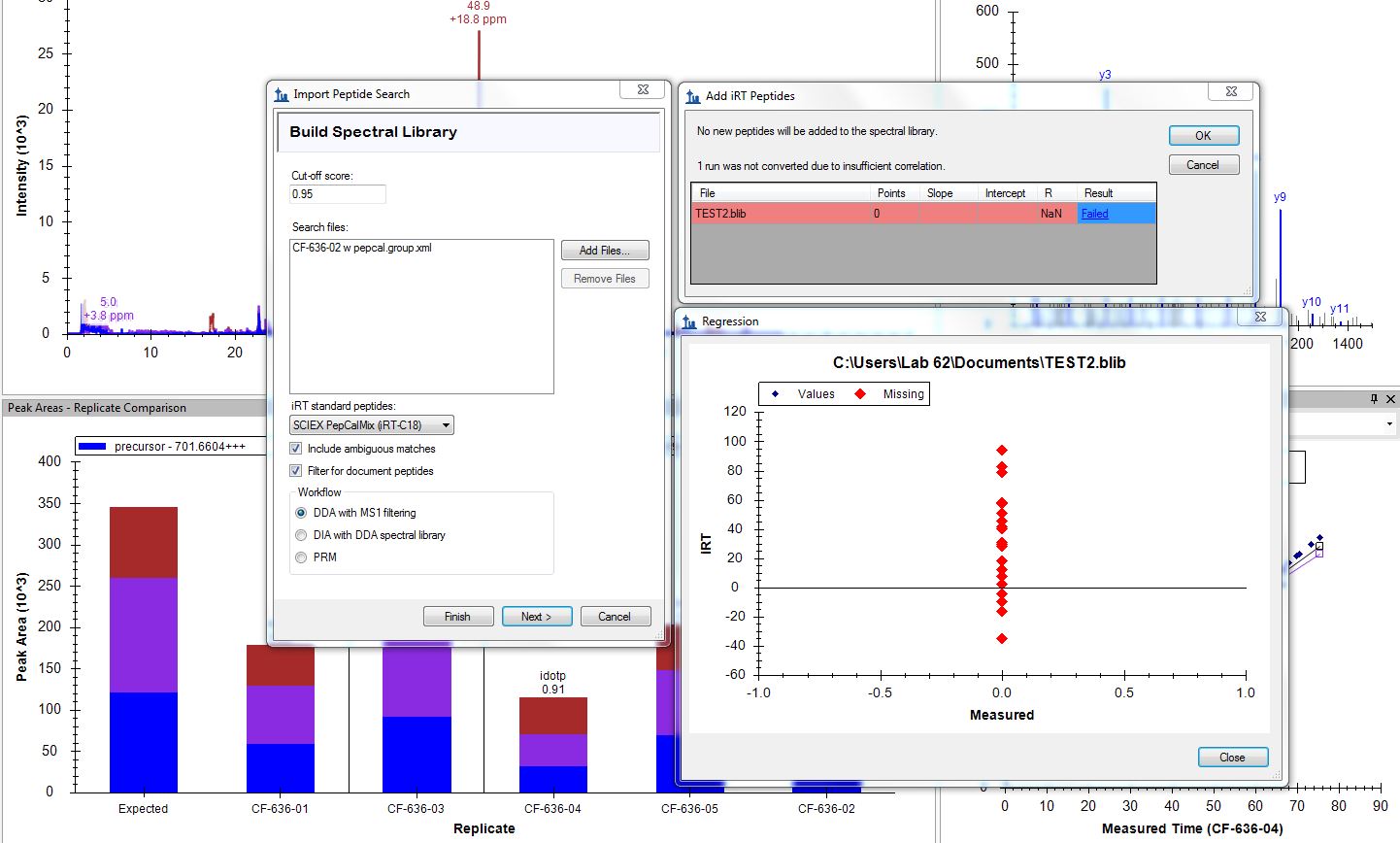 Dear Skyline team, I am doing a DDA analysis, but when I am building spectral library the SCIEX PepCalMix (iRT-C18) are not detected in my samples spiked with Pepcal. I have attached a screen shot of the problem. Thanks, |