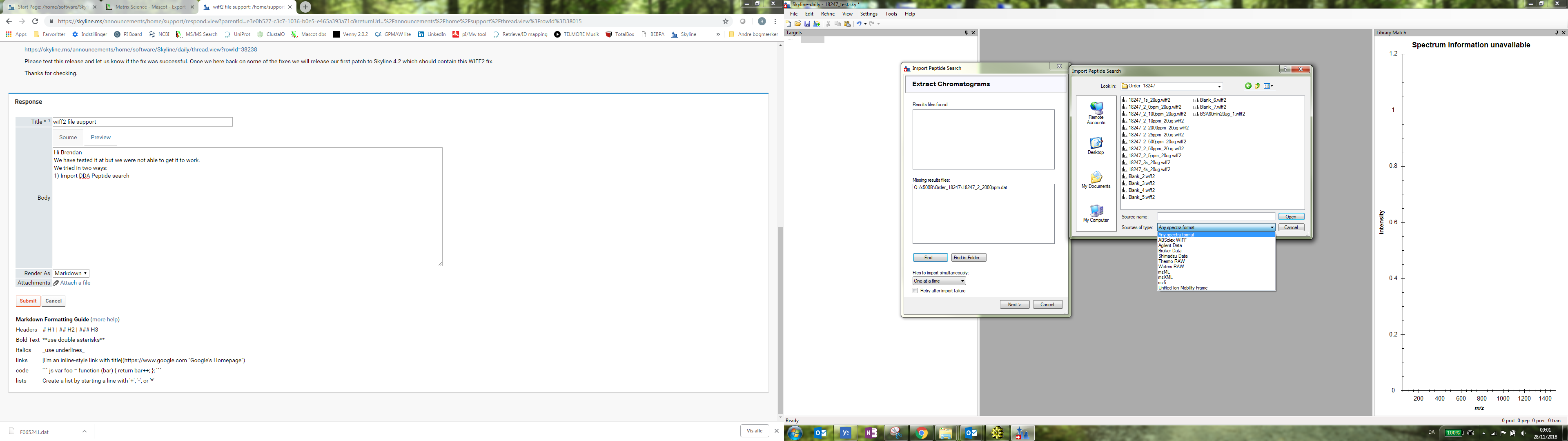 - Import DDA Peptide search, but were not able to import the wiff2 in the "Import Pepetide Search" step (skyline_wiff2_1). Wiff2 is not on the list and selecting a wiff2-file does not lead to any importing.