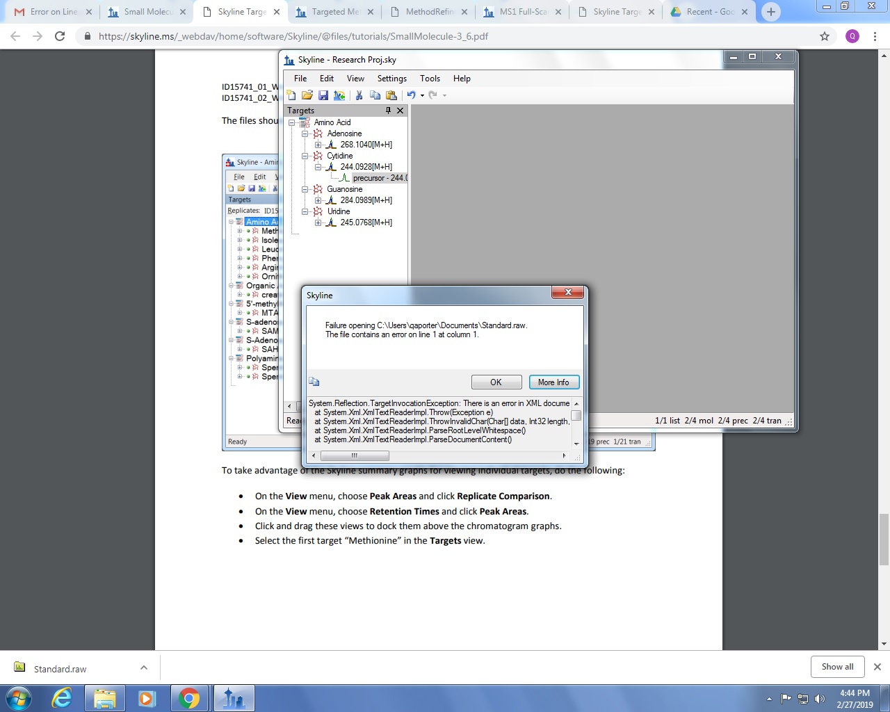 Hi, again. I made the transition list with the small molecule, but then when I finish the list and tried to open the raw file, again it still wont let me open the raw file. The reason I doing is so that I can get my retention times on a calibrate curve/line. But, I keep having the same problem, I add the picture to illustrate the problem. |