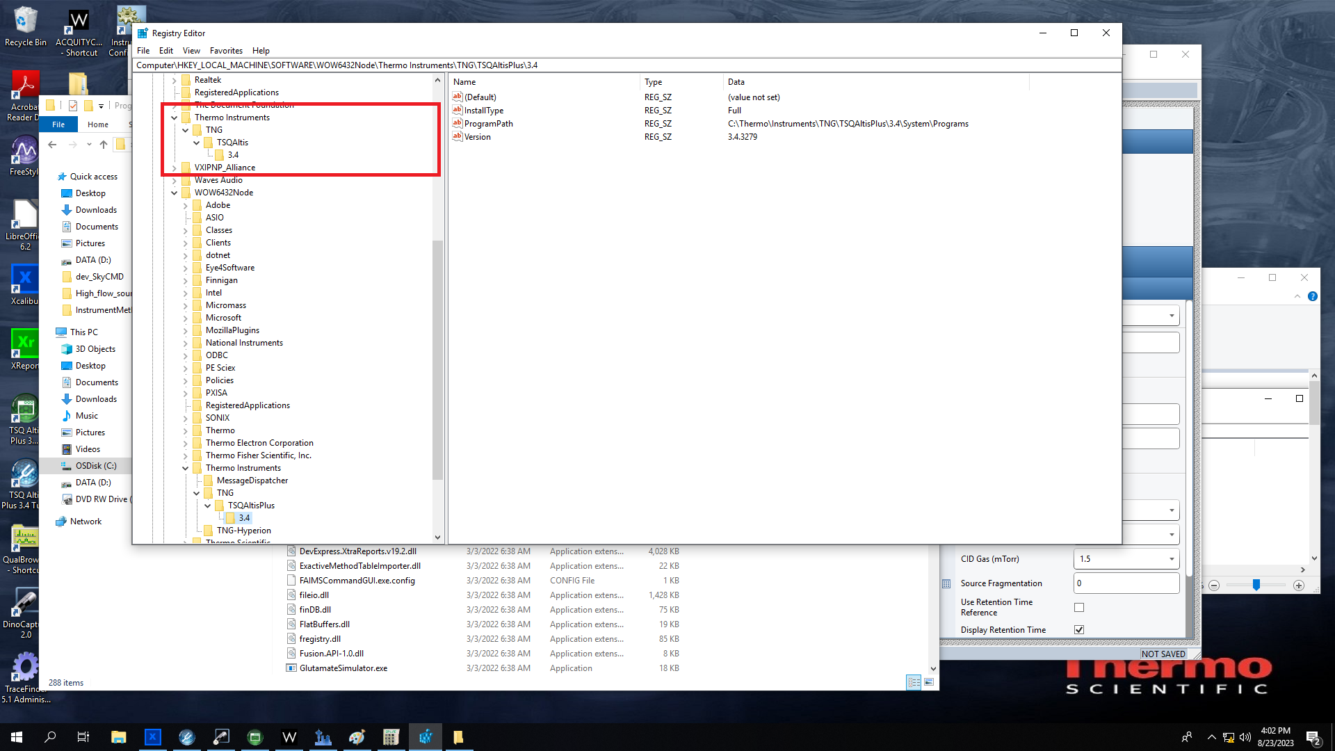 It just looks at the first sub-key of TNG and then the first sub-key of that key, and then the value ProgramPath in there. From the screenshot you have provided that would be the TSQAltisPlus\3.4 key. Does the 3.4 key contain a value "ProgramPath"? If so, does the path it contains point to a folder that contains the DLLs listed above?