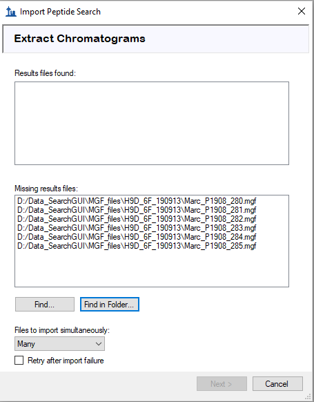 I tried to use Skyline(v.19.1) for MS1 filtering + spectra library building, by importing a mzIdentML file from PeptideShaker (v.1.16.42). While the spectral libraries were built, I got stuck in the peptide search import at the Extract Chromatograms part. The MGF files referred to in the mzIdentML file were missing. SEE ATTACHED.