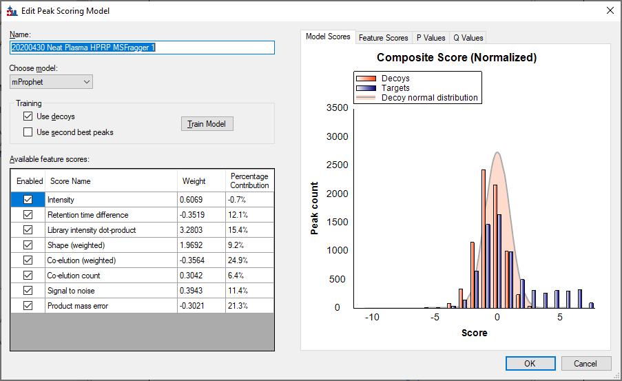 That is also what I'm seeing when I run the scoring model and look at identified peptides. I expect that far more peptides should be able to be identified from this data, as the same files when searched against a similarly generated SL in PEAKS result in ~5500 peptide IDs with ~4700 unique sequences across the 6 samples at a score cutoff well above what PEAKS considers to be 0% FDR to filter manually for what look like high quality spectral matches. Of note, if I import this same library directly from PEAKS and use it in the same Skyline template I have uploaded, I receive similar results to what I see with the MSFragger library.