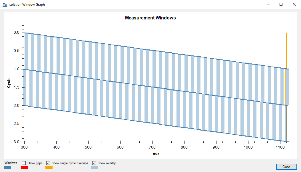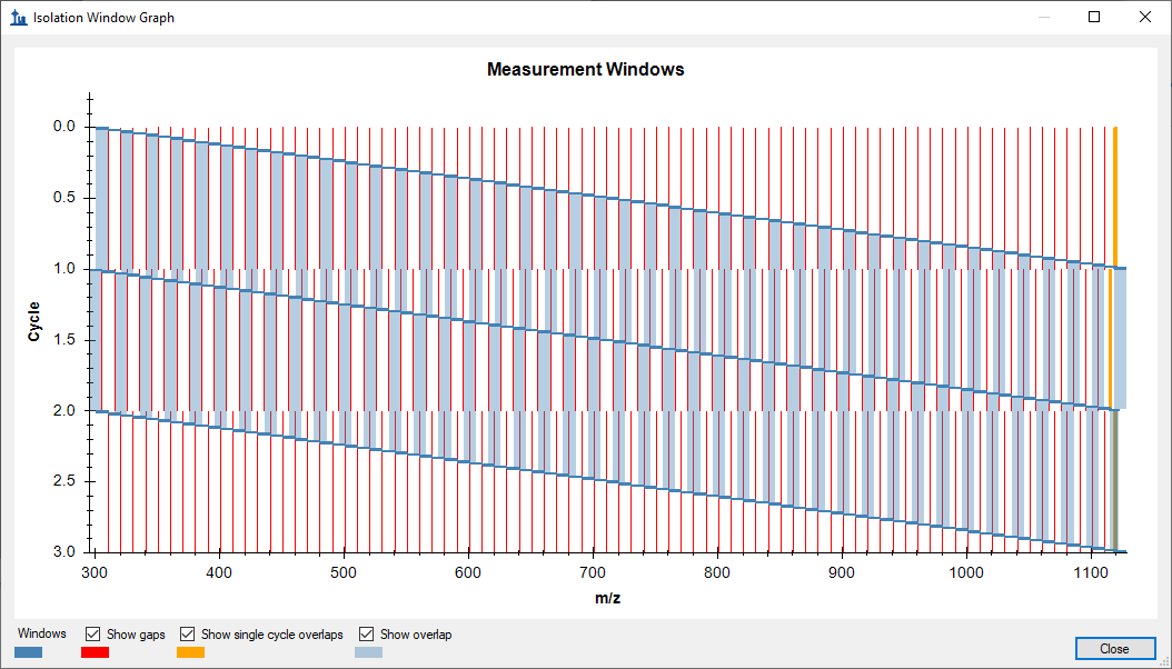 You can see that End - Start = 10 always, but Start is specified out to 4 decimal places with no sign of rounding. Skyline might come up with the same Start values, but it would not use exactly Start + 10 m/z for the End values. However, I wouldn't expect these small gaps of around 0.0045 to cause an issue. So, you can just uncheck the Show gaps checkbox in the form to see the less cluttered graph also attached, which shows the overlap issue at the end of the cycle.