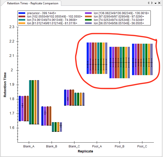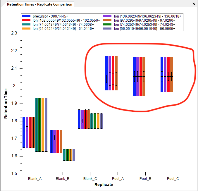 I did the manual integration of the first 4 transitions (prec + frags down to m/z 97). Then I've added 4 frags in the target list with the expected RT at 1.86 min without setting a RT tolerance window.