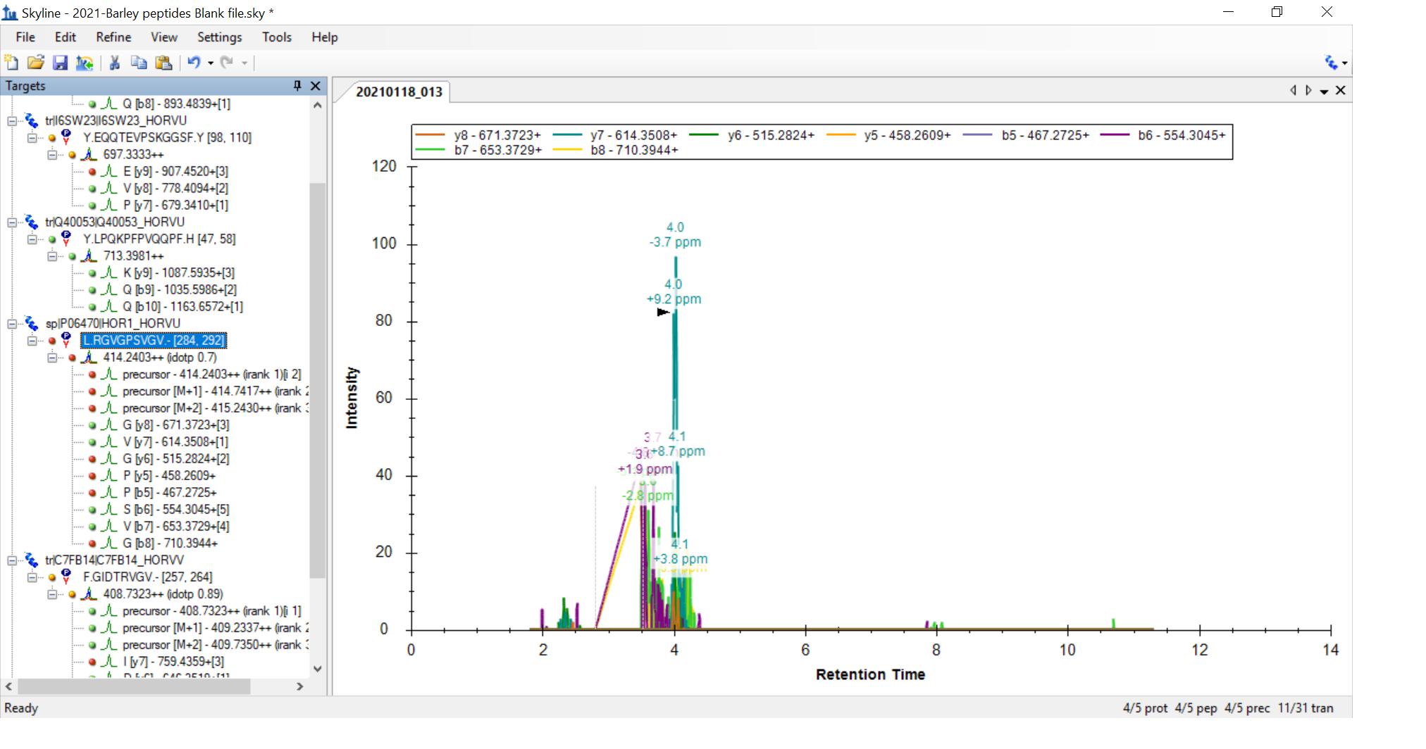 I am working on peptide quantification with Water QToF-MRM method, I have five peptides and five MRM methods for one injection. From Masslynx, I could see the 5 peptides are detected, and they have been divided into two function channels (four MRM in Function channel 2, and one MRM in Functional channel 3). However, when I import the raw. file into Skyline, I could see the four peptides MRM very well, but the one peptide in Function channel 3 behaved strangely (it did not pick up the peptide at retention time 3.27 min). I was playing with the fdc. file to change the function number to the same, it did not work. I attached the chromatogram I obtained from both Masslynx and Skyline, appreciate if someone could help with the data import. Thanks!