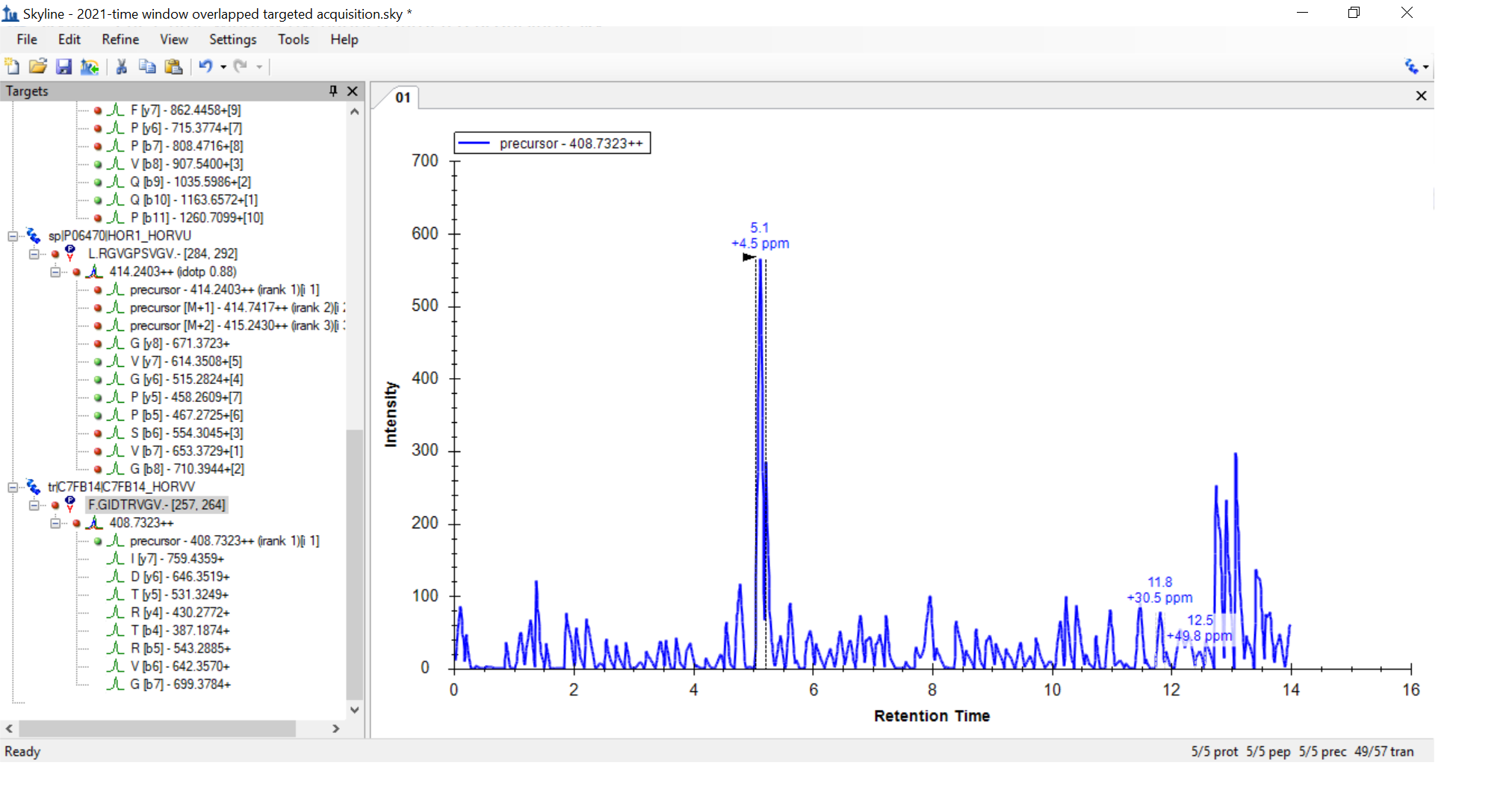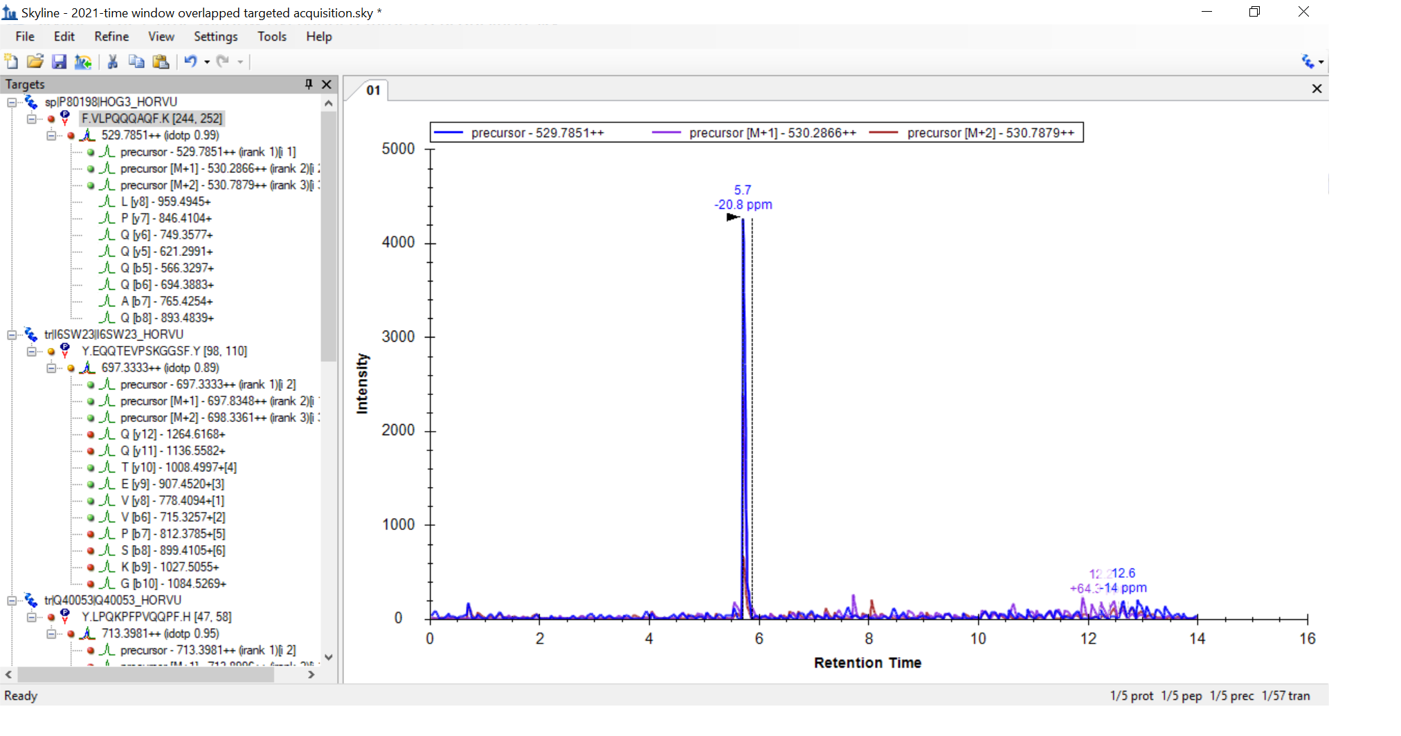 I just tried to import this time window overlapped data with 5 MRMs to Skyline with both 'targeted' acquisition and 'DIA and all ions', and obtained very different chromatograms. Could you have a look to help me understand this? When I have 5 MRM light peptides detection, and another 5 MRM heavy labelled peptides for quantification, there will be overlapping time windows, and I wonder how the data acquisition goes.