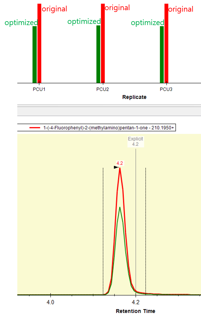 - Compared two methods( one = original method earned by direct infusion ; the other = obtained by CE optimization)
