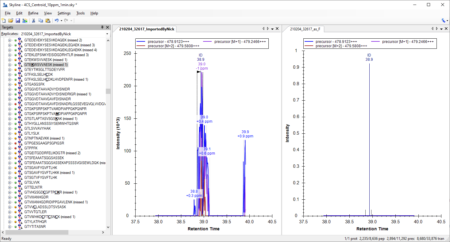 https://skyline.ms/tutorial_dia.url) which is unfortunately from 2014 and badly in need of an update. We would now generally recommend using centroided spectra for DIA. So, that is what I am suggesting, but I also just ran into exactly the same issue as you are reporting with the precursor spectra, and I just found that it has to do with interference shifting the m/z centroid out of the expected range.