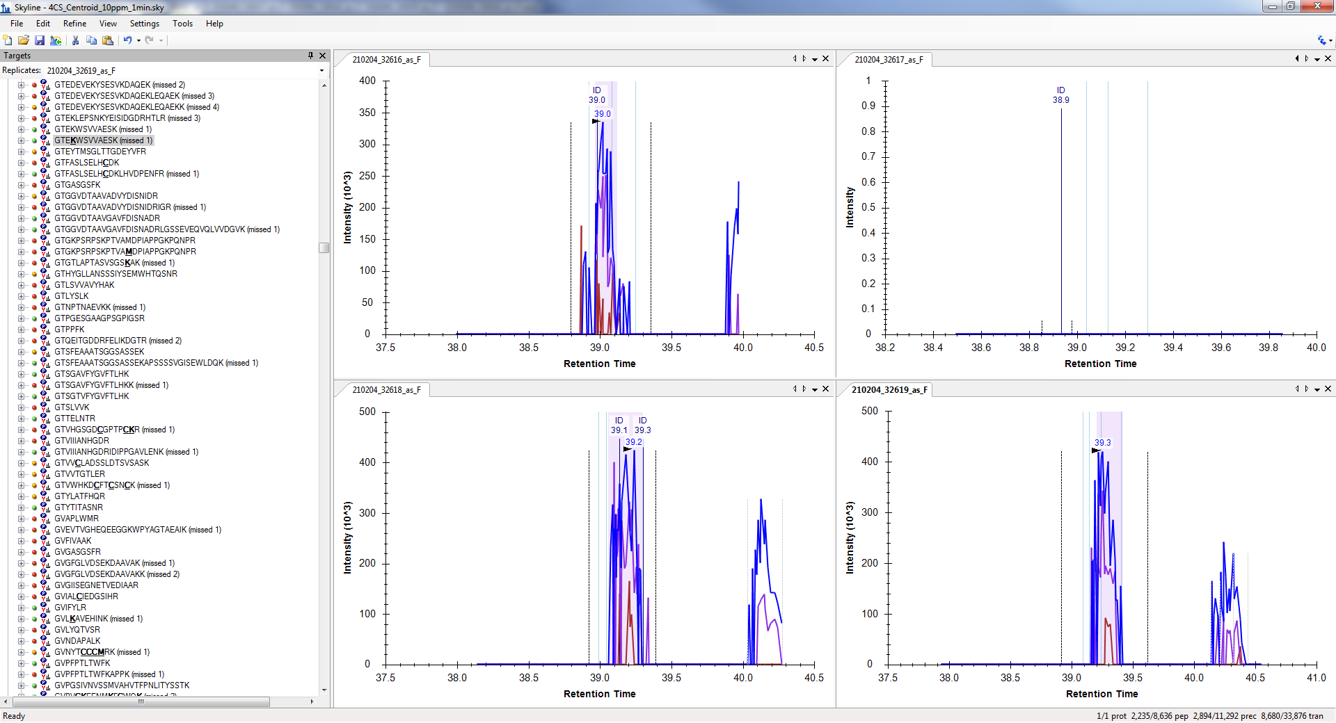 I have attached a PDF that shows the case for the charge 4 peptide precursor GWCLESSQCQDLTTESNLLECIR++++ in the DIA tutorial with profile spectra extracted as described in the current tutorial (resolving power 35,000 at 200 m/z) and centroided spectra extracted as we would currently recommend by default (mass error +/- 15 ppm).