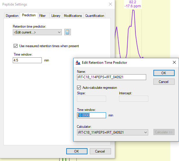 Dear Skyline-team, I am using the current version of Skyline Daily 20.2.1.454 and noticed a bug when changing the scheduling window with an iRT predictor. No matter which value(2, 4, 5 min) we set the window to, Skyline keeps the window at 10 min. I first thought that this might be purely a visualization error, but the constant 10 min windows are also apparent in the inclusion lists we export. We also tried fixing the problem by exporting the whole project ("share") and opening it on a different computer, but the problem persisted. Hope you can have a look at the attached project and help us with this issue. Best Robert |