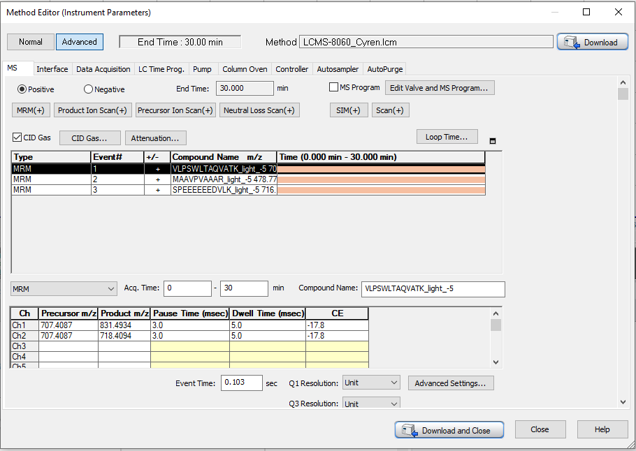 I exported my transition list to Shimadzu LC-MS 8060. However, the transitions do not seem to be carried over properly. Almost all the heavy peptides are missing on the list (.txt file) and the m/zs looks a bit jumbled. I attach here my .txt file and also the .sky file where I exported my list for your reference. The Skyline version I used is Skyline (64-bit) 23.1.0.268. For the parameters, I selected Instrument Type: Shimadzu, Collision Energy: Shimadzu QQQ, Delustering Potential: ABI.