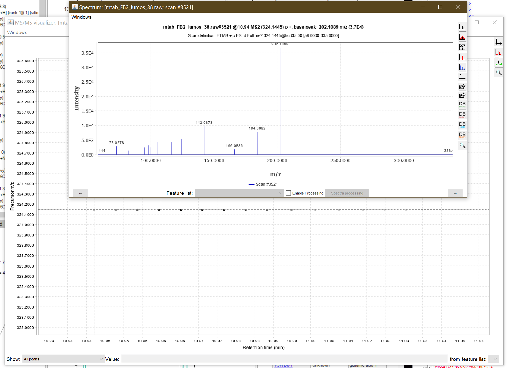Hey there. This is my first time posting a question, and I've gotten bits and pieces of an answer from other posts, but here's the gist: The lowdownI'm working with metabolites (so, molecule settings), and with .RAW files from a Thermo Orbitrap Fusion Lumos. We're running it in targeted mode, so MS2s are only collected when the precursor shows up. We're quantifying based on MS1 ratios to heavy (13C6), and verifying the location and identity of the EIC based on MS2 products. The fragments in question generally seem to be in the files--I have attached a screenshot of MZmine, which shows the rt locations of several MS2 scans and the expected product ions for pantothenic acid. Skyline, however, does not show these ions. This is not always the case. When a really concentrated standard is run (>100x my highest standard curve point; not included in the attached doc), Skyline picks up on some of the transitions; however, I would assume that since the peaks in a "normal" sample still can appear at e4-level intensity, I am suspicious that there is an over-restrictive baseline calculation algorithm hidden somewhere I just haven't found. notes