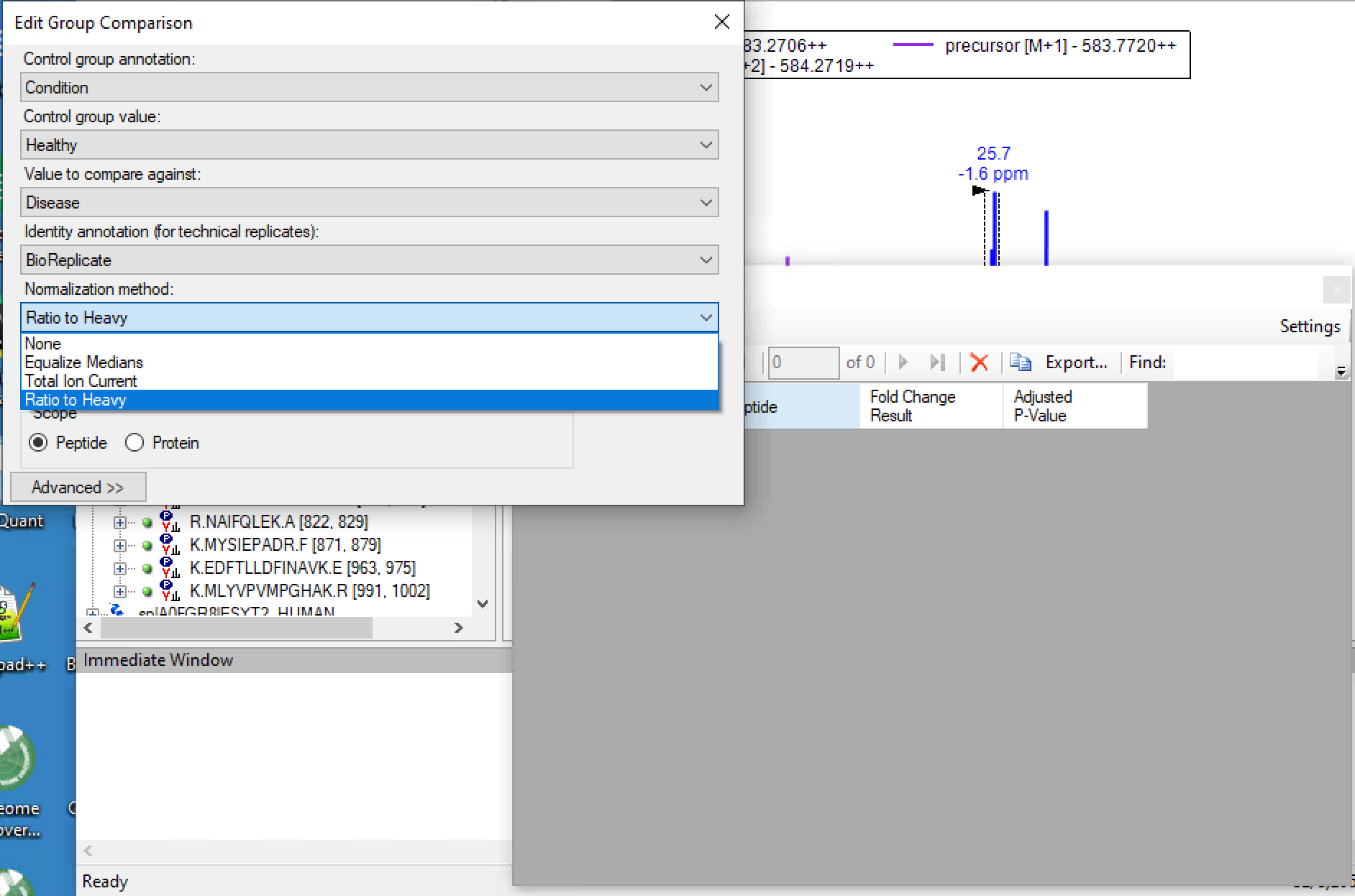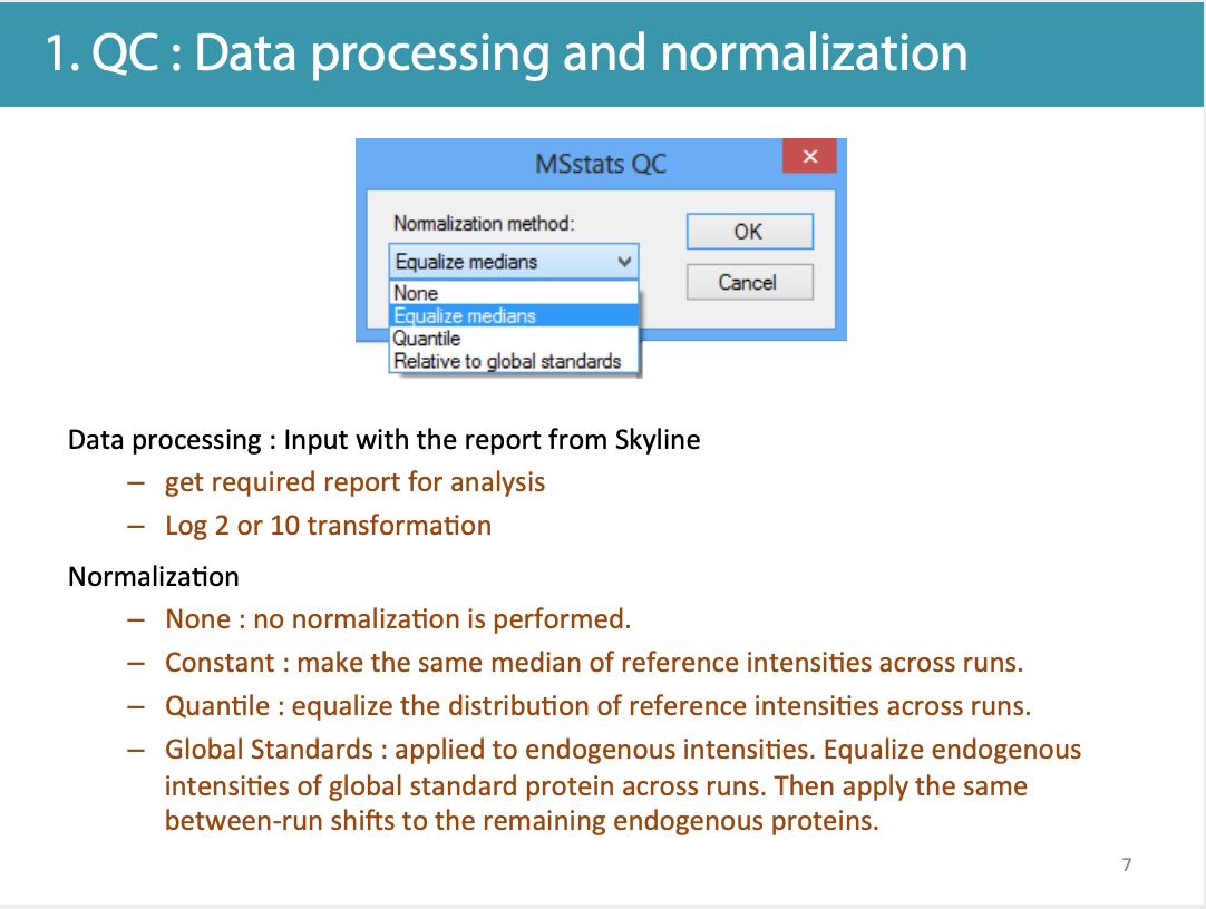 MSstats offers Quantile normalization, but Skyline does not offer that as an option. Quantile Normalization works by making it so that, for instance, the 95% most abundant peptide in each replicate will have the same normalized area.