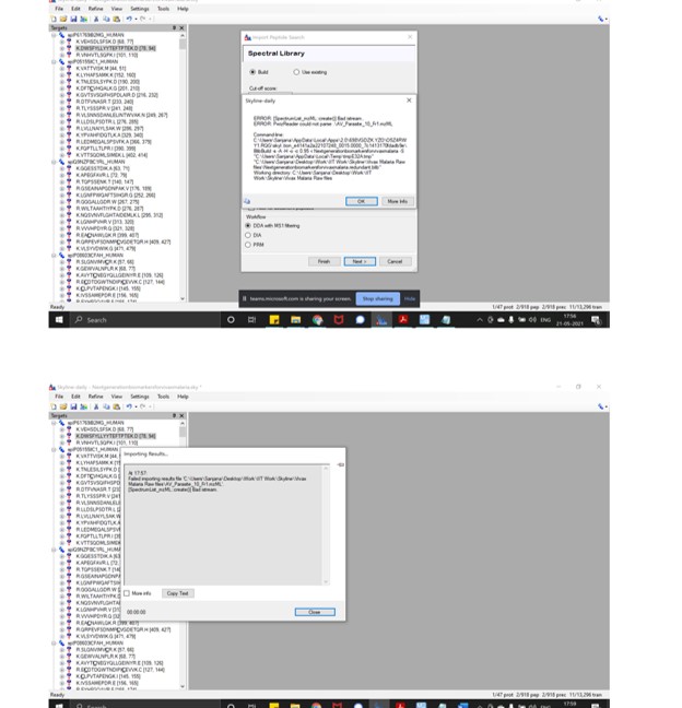 I am unable to build a spectral library or import results during my proteomics analysis. I had followed all the instructions from the tutorials as well. An error message shows up whenever I try to perform either of these tasks. Could you please guide me so that I can resolve these issues? I have attached a screenshot the two error messages that I encountered.