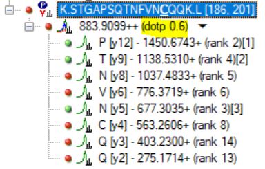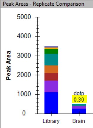 I was using Skyline for analyzing an MRM based data and also using a spectral library. During analysis, for some of the peptides, I noticed that the dotp value shown in 'peak area view' and that in 'target window' are different. However, for most of the other peptides, it is same at both the places.