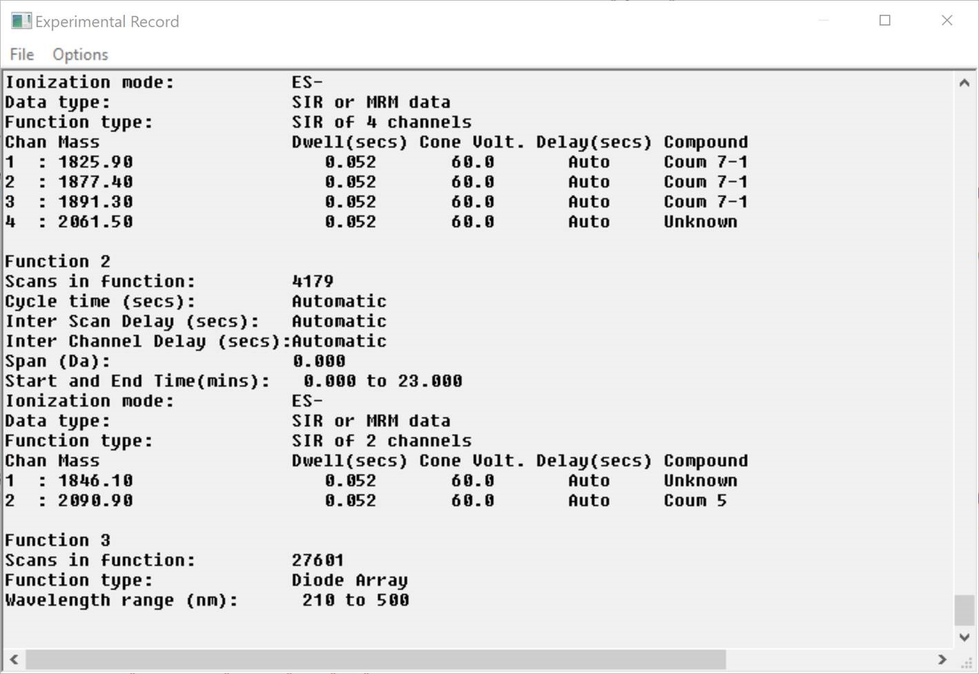 2) open the raw file and click on "Experiment..." and copy paste the information (see pictures 1 and 2 on the first message). Both methods are laborious and lot of lines/column needs to be cleaned before the table can be imported as a transition list into Skyline. If other Waters users know how to do this step in a faster way it will be appreciated. Sometimes we have methods with lots of compounds and an automated way to import transitions list will help us a lot. Thanks again and best regards, Gioele |