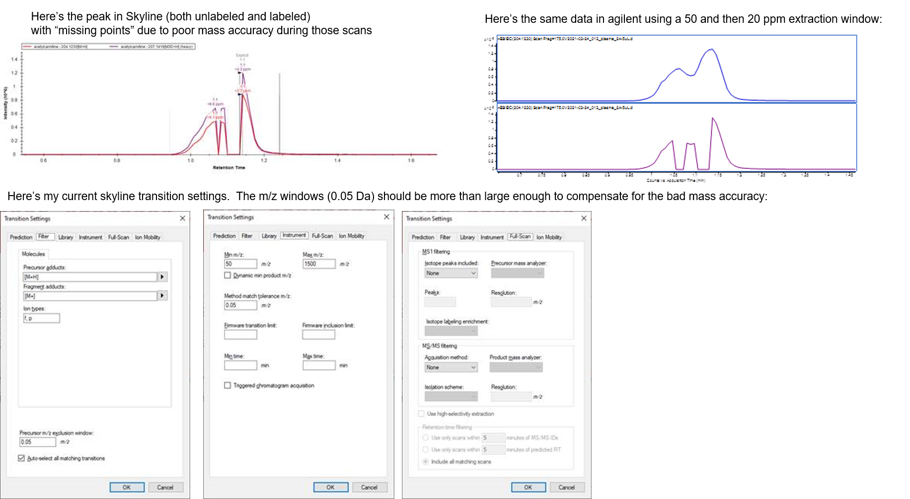 Apologies in advance for what may be an elementary question. I’m trying to use Skyline for analysis of small molecule data collected on an Agilent TOF. I have a data set in which, for one or a few data files, the mass accuracy wasn’t as good as it should have been for a few scans (probable intermittent loss of reference ion due to co-elution with salts or other interfering species). Those scans fall in the middle of a few peaks I’m trying to quantitate; for example, acetylcarnitine. This particular peak has an ugly "split" appearance due to poor retention on the column, but Skyline handles it fine for most of the data, the issue only crops up when the mass accuracy for a few scans is poor. In those cases, skyline is integrating only one part of the peak. I’d like to widen the “mass extraction window” (not the "skyline" for it, I realize, but concept should be the same) so I can get integrate the whole peak. This works fine in Agilent Quant software. But no matter what parameter I try changing in the “transitions settings” menu, the split peak doesn’t change and the integration is wrong. The attached image illustrates the problem. I could just use Agilent Quant for this project but I’m hoping to use it to analyze data on multiple different instruments and I like the “unifying” nature of Skyline software. Obviously an even better fix would be to solve the mass accuracy issue, but this crops up often enough that I'd like to be aware of a workaround, if one exists. Thanks very much for your help! Charles |