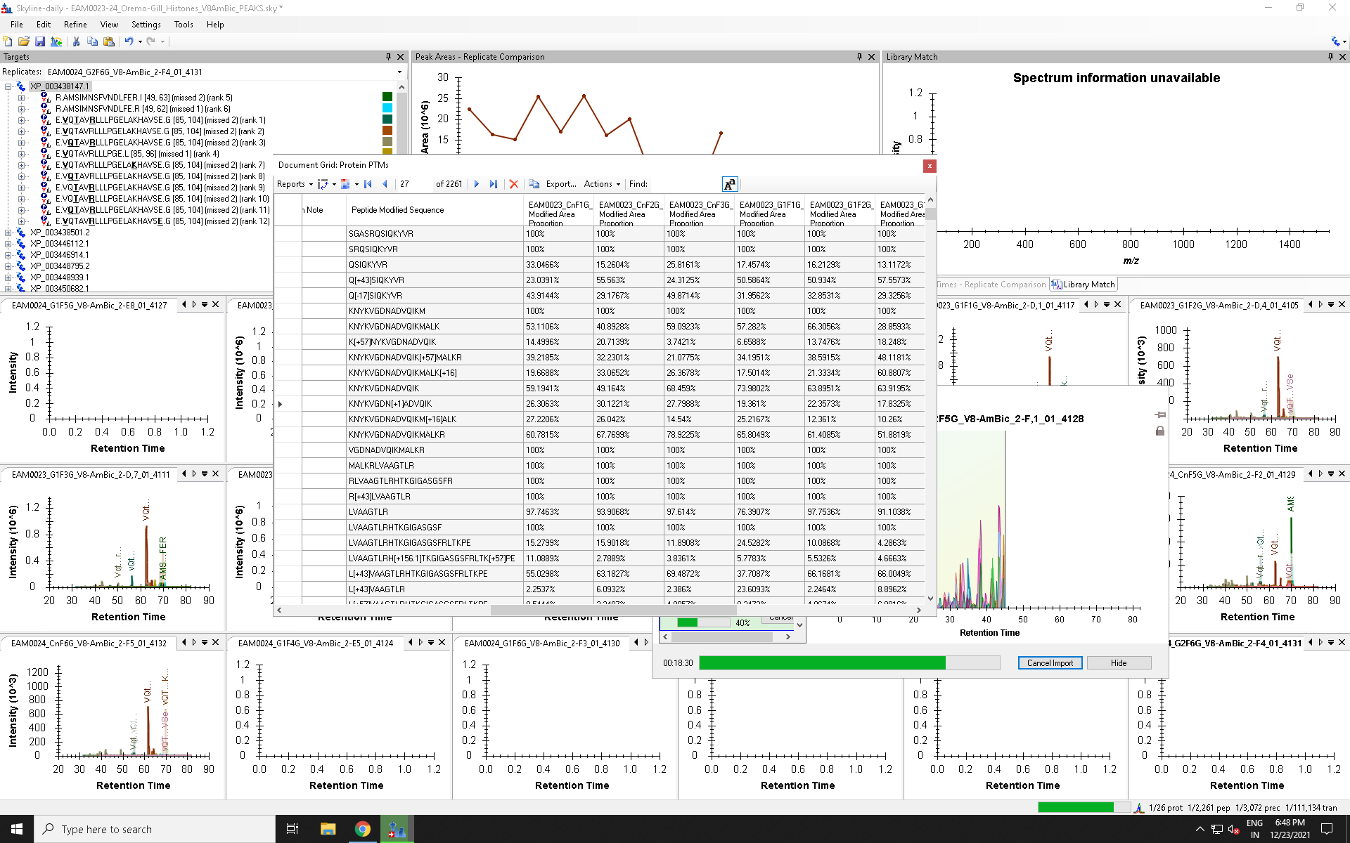 The following is a wishlist item I have for future implementation in Skyline re: PTM scoring. Right now the scoring of PTM peptides is based on the ratio of modified versus unmodified peptides but that ratio is based on the peptide sequence rather than the AA position. This works fine if one does not have any missed cleavages or semi-cleaved peptides but in reality there is always a certain amount of missed cleavages and semi-cleavages in complex samples or histone extracts collected from cells or tissues. It would be more accurate to base the ratio of modified versus unmodified peptide on the AA position in addition to the type of modification such that peptides of different starting and ending AAs (semi- or missed cleavages) that contain the PTM AA will be considered for calculating the overall peptide ratio.