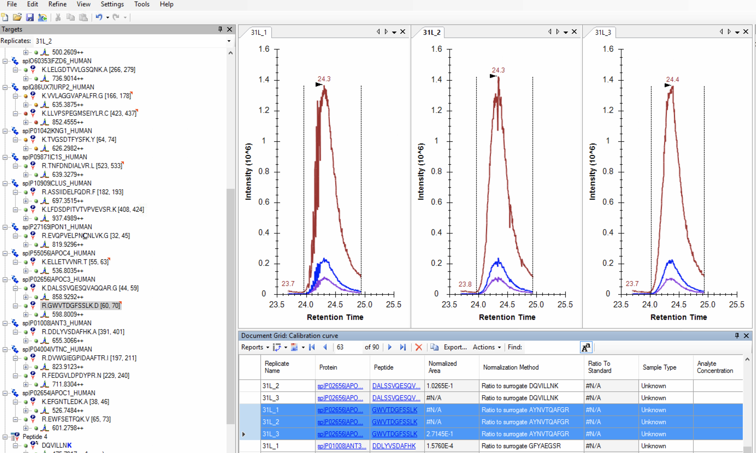 The image shows 3 replicates of a peptide called : "GWVTDGFSSLK" and you can see all 3 transitions of the peptide detected at each replicate but as highlighted in blue, replicates 1 (31L_1) and 2 (31L_2) are showing #N/A values.