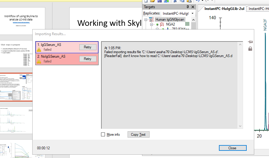 I am not able to import two of my LCMS files while one which was done as a control with glycans from a kit are working. I have uploaded the three files as a zip folder, as well as a screenshot of the two files which aren't uploading. My operating system is Windows and I'm using Skyline 21.2.0.369.