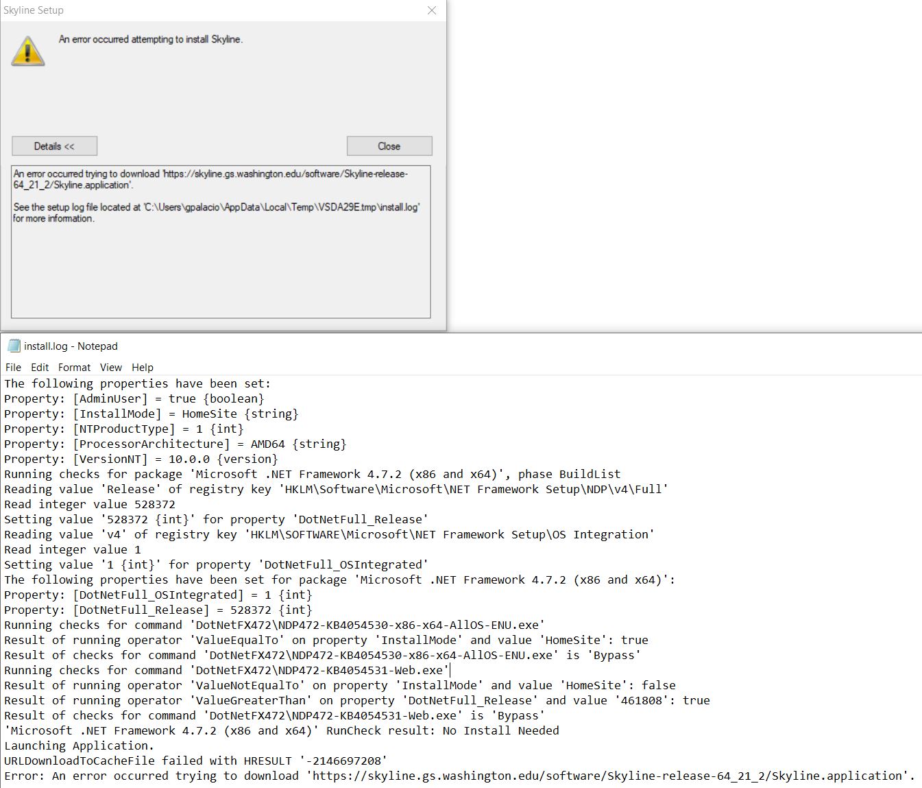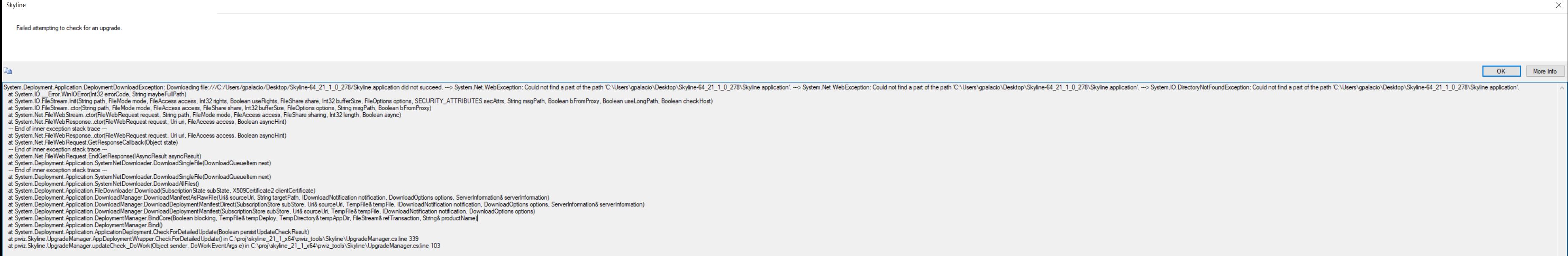 Dear Sirs, I need help to troubleshooting my inability to update one PC to the latest Skyline version. I also tried to re-install it using the downloaded setup file, but this operation also fails. I made screenshots of the error messages from numerous failures to upgrade and failures to re-install attempts. I have also included an screenshot of the system information where these issues keep happening. Of note: I also have Skyline in another PC, with much less memory RAM and processor power, and in that one the latest update did happen with no inconvenient.