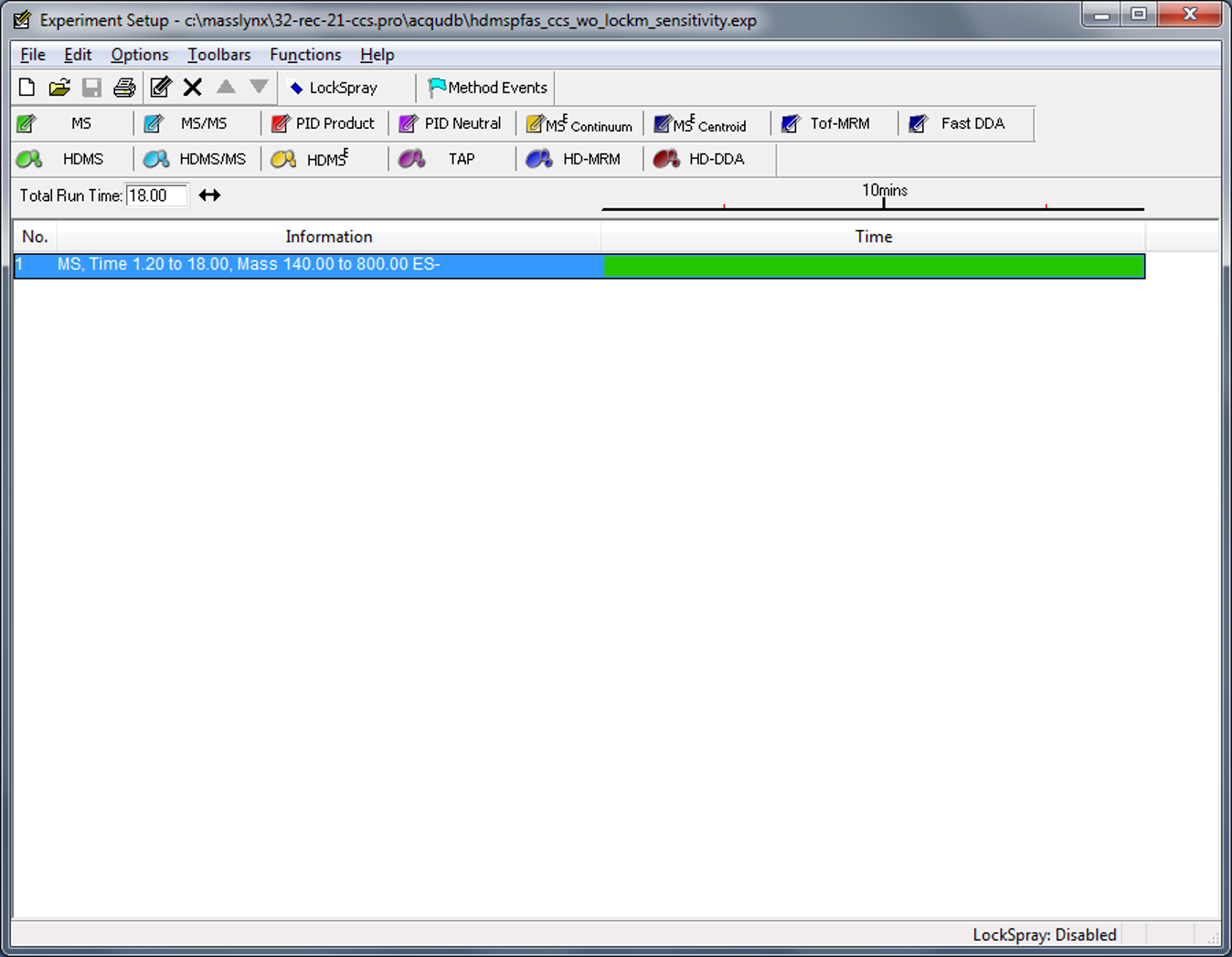 1. In the Instrument Setup software, there is a tab called "Functions" that allows adding an experiment to the MS setup file. The possible experiments are (1. HRMS) MS, MS/MS, PID Product, PID Neutral, MSe Continuum, MSe Centroid, Tof-MRM, Fast DDA; (2. HDMS) HDMS, HDMS/MS, HDMSe, TAP, HD-MRM, HD-DDA.