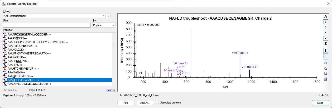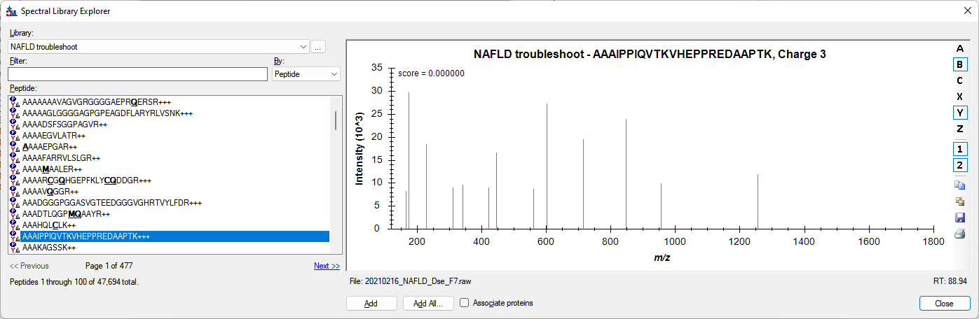 I looked up this peptide "AAAIPPIQVTKVHEPPREDAAPTK" with no predicted fragment ions that you mentioned - it does not exist in the "20210222_NAFLD_combined_medium_consensus.pdresult" file or the Biblio spec library on built on v19.