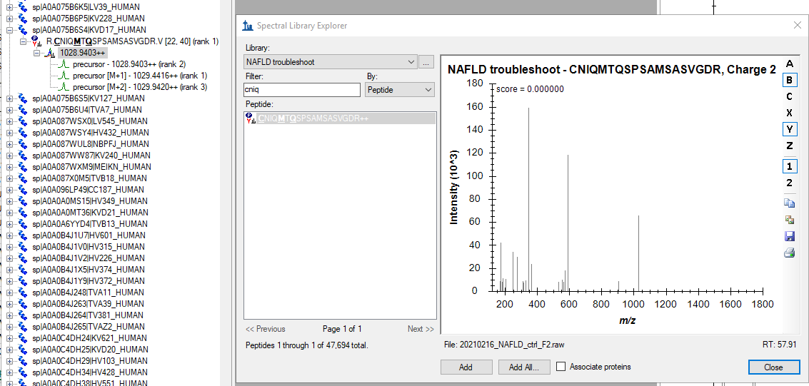 I exported all the transitions from the problematic v21 document to csv and found more peptides with no fragment ions just from the first few 50 rows. This other example "cNIQmTq_SOSAMSASVGDR" from KVD17_HUMAN also does not exist in the "...NAFLD..." PD result file, and is also not present in the library on v19 build. I think we have isolated one issue: mystery peptides with no fragments in the library.