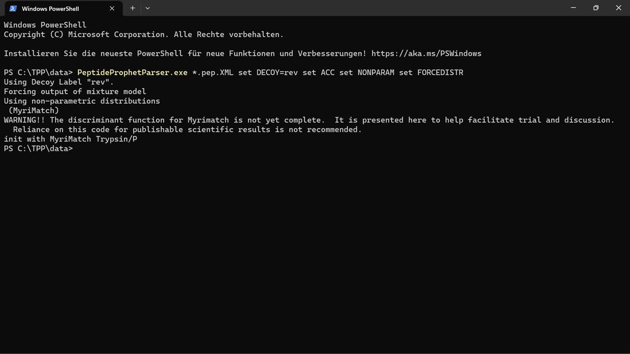 (Folder where I have the pep.xml files and the program within TPP):\PeptideProphetParser.exe *.pep.xml set DECOY=rev set ACC set NONPARAM