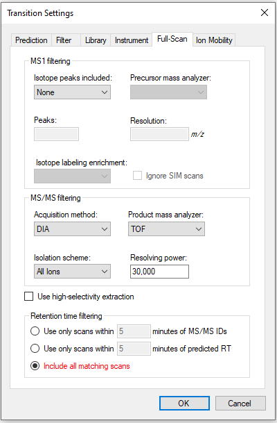 You would not want to use "DIA/All Ions" for this data. That setting would only be appropriate for things like GC MS where the mass spectrometer fragmented everything without first filtering by precursor m/z.